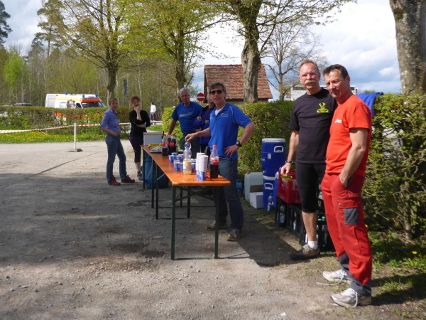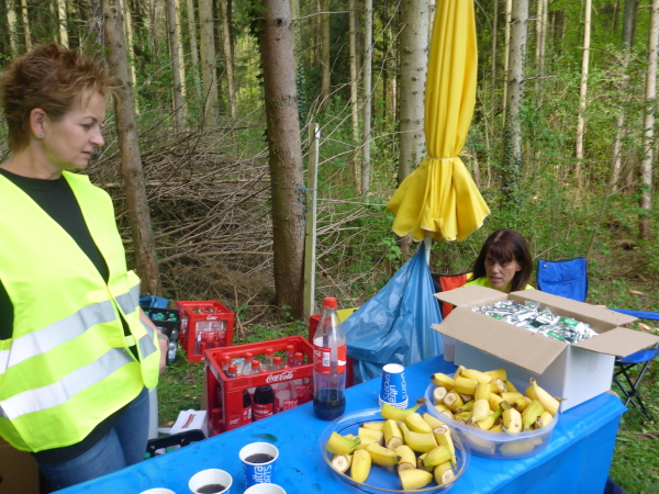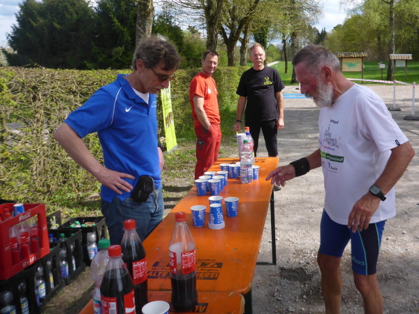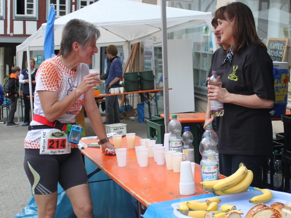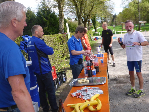 Ein Helfer will mir den Zeitmess-Chip vom Schuh schneiden. Geht nicht, ich habe ihn unnötigerweise mit den Schuhbändern befestigt. Also wird erst mal der Schuh aufgemacht. Nachdem ich den Chip los bin, kann ich mich an der Zielverpflegung stärken.