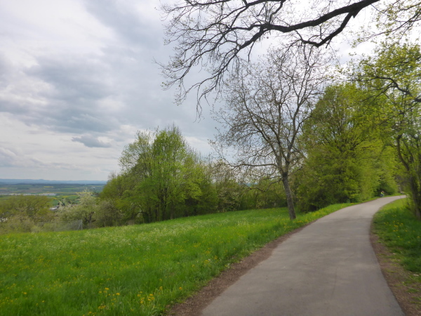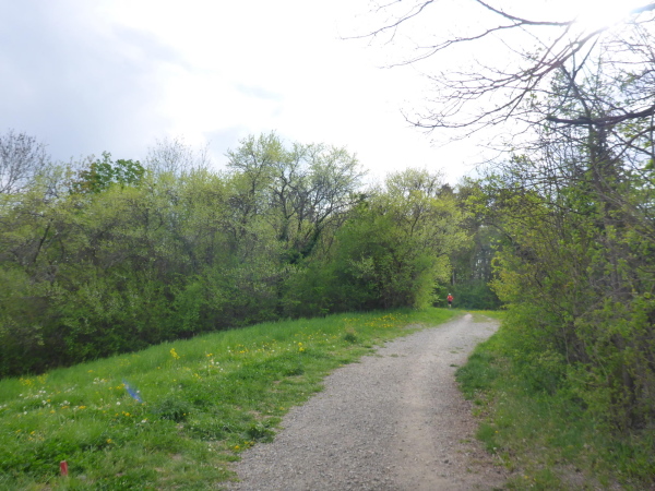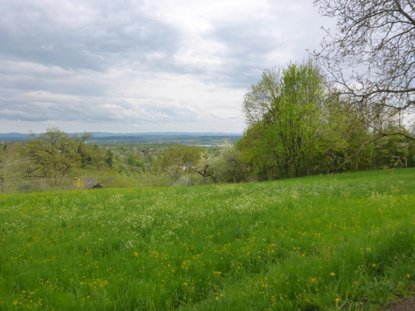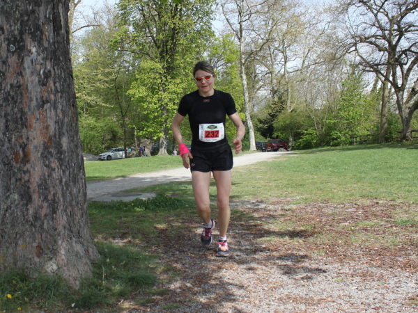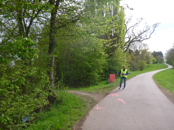 Angefeuert von einem weiblichen Streckenposten, geht es ein Stück durch das Wäldchen und anschließend durch grüne Wiesen. Wir sind noch ziemlich hoch, dafür dass das Ziel ja unten in Herrenberg liegt. Eine Helferin weist zu einem Trail, der leicht bergab geht. Auf einem Spazierweg laufe ich erneut an klatschenden Streckenposten vorbei. Unter uns liegt wohl schon Herrenberg hinter den Bäumen versteckt. Mit krampfigen Beinen sehne ich das Ziel herbei. Plötzlich stehe ich vor einer Wegsperrung und dem wohlbekannten Schild, das scharf links zeigt. Hier geht es nochmal richtig steil bergauf! Leise fluchend nehme ich den hoffentlich letzten Anstieg in Angriff.