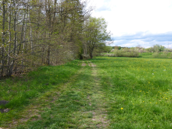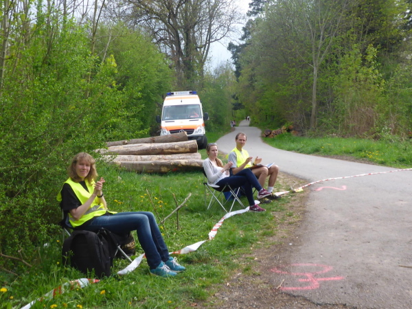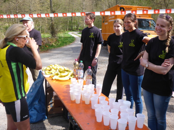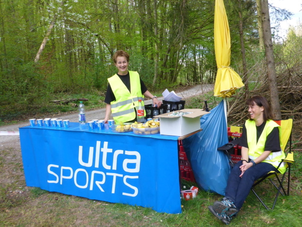 Am Rande einer großen Wiese haben zwei gutgelaunte Mädels ihre VP. Wir unterhalten uns kurz. Viele Läufer hätten nach Iso gefragt. Obwohl in der Ausschreibung nur von Wasser und Bananen die Rede ist, gibt es hier zusätzlich Cola. Generell denke ich, dass man das für sich Wichtigste immer selbst mitführen muss. Trotzdem nimmt man meinen Hinweis auf, zukünftig Salz bereitzustellen.