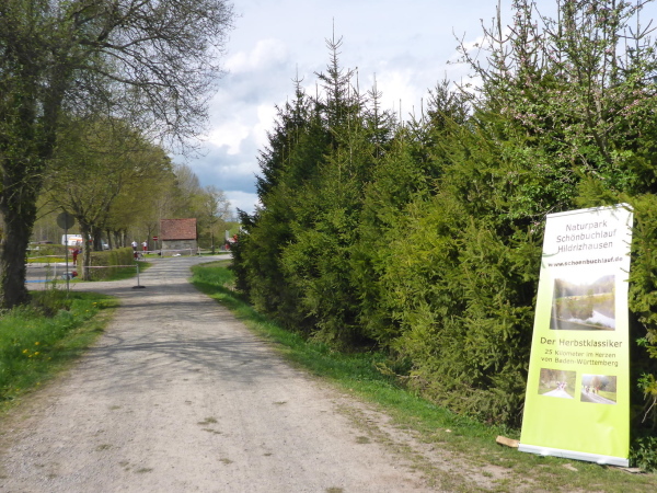 Hier geht es nun weitgehend flach geradeaus. Wir überqueren den Goldersbach. Immer weiter zieht sich die Strecke geradeaus. Hinter km 30 erreichen wir die nächste VP. Ein Banner kündigt den „42. Naturpark-Schönbuchlauf“ im Herbst an. Dann kommt nochmals eine Zeitmessmatte. Ich bin total kaputt. Die Helfer versuchen mich aufzumuntern. An dieser Stelle muss ich zugeben, dass ich die Strecke völlig unterschätzt habe. Dazu noch das unerwartet warme Wetter - das gibt mir den Rest. Aber aufhören ist keine Option. Also weiter.