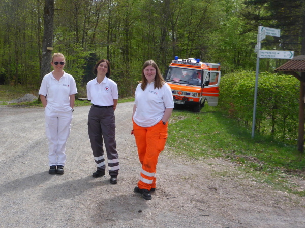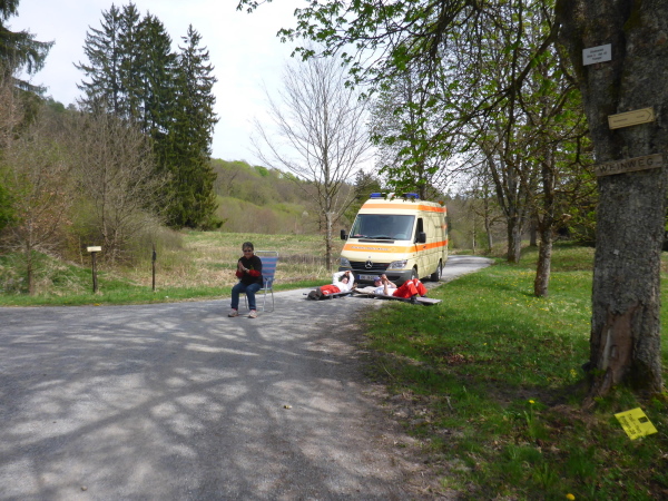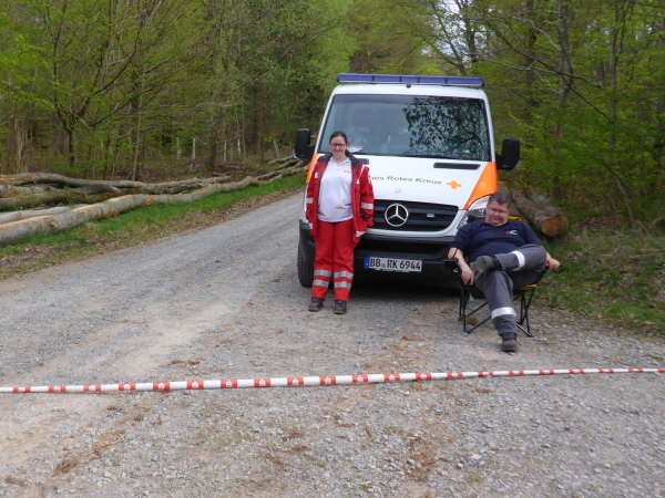Dann erreiche ich endlich einen Streckenposten. Hier geht es links. Zwei Läufer kommen von hinten. Ich hänge mich dran und kann sogar nochmal überholen. Eine freundliche Helferin sitzt mitten auf dem Weg. Es geht erneut links, endlich wieder auf einen Trail. Sie mahnt zur Vorsicht - es sei unwegsam. Ich verspreche aufzupassen und bremse abrupt meinen Schritt, denn es ist wirklich schlecht zu laufen. Wurzelig und von Rinnen durchzogen schlängelt sich der Trail nach unten. Ich muss aufpassen, um mir nicht die Füße zu verdrehen. Unten stehen zur Sicherheit Sanis und applaudieren.