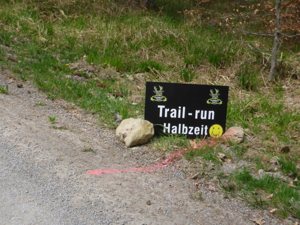 Die Halbmarathondistanz erkenne ich an einem kleinen Hinweisschild, das verheißungsvoll am Wegrand steht. Gleich dahinter kommt dann die nächste VP. Nun achte ich darauf, ausreichend Flüssigkeit aufzunehmen. Es gibt unter anderem Johannisbeerschorle des Sponsors – lecker und gut zu trinken. Aber auch Apfelsaft wäre im Angebot. Noch ein Stück Banane und weiter geht es bergab. Einigermaßen locker erreiche ich den Talgrund.