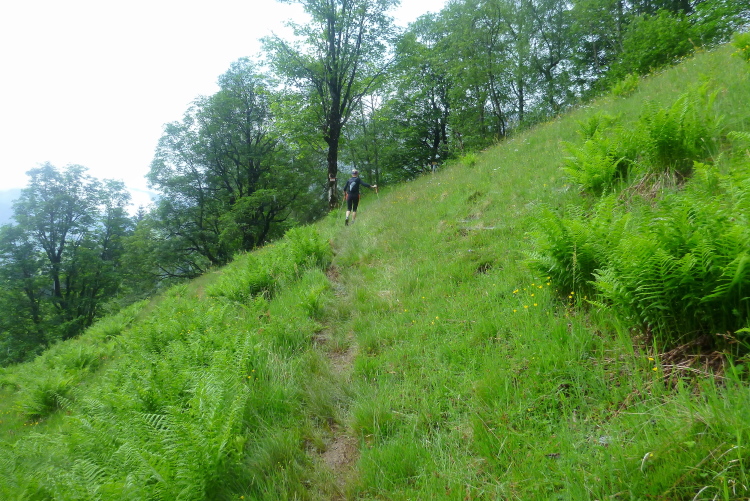 Danach heißt es Einsortieren im Startkanal zur stichprobenartigen Kontrolle der Pflichtausrüstung (Erste-Hilfe-Ausstattung, Handy, Regenjacke, Riegel, 1 l Flüssigkeit). Ich habe für alle Fälle sogar eine komplette Wechselgarnitur Wäsche dabei, denn es wird hoch hinausgehen und man weiß ja nie. Nochmals können wir die Startaufstellung verlassen, aber um 9 Uhr wird es ernst. Ich bedauere die armen Mitläufer, die bei Wind und Regen vergleichsweise halbnackt laufen müssen, damit auch jeder ihre blau oder sogar farbig verzierten Körper sehen kann. Von der Polizei begleitet verläuft der erste gute km noch im Ort, bevor wir auf einem Kiesweg erstmals in die Botanik abbiegen. Auf dem Weg geht es gut voran, ein erster Wiesentrail erfreut Herz und Seele der Trailer. Wald- und Wiesenwege wechseln sich ab, stramm geht’s bergauf und gibt uns einen Vorgeschmack auf das Kommende.