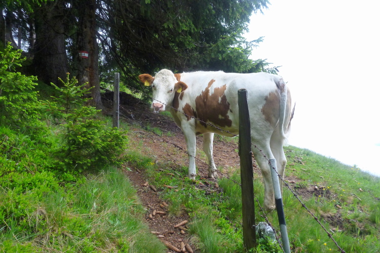 Vom breiten Wirtschaftsweg biegen wir bald wieder auf Singletrails ab. Das kostet mich Zusatzzeit, ist aber dennoch landschaftlich herausragend. Auch wenn ich langsam bin, genieße ich diese schmalen Trampelpfade sehr. Über Viehweiden steigen wir höher und höher, die Mitnahme der Stöcke, über die ich lange nachgedacht hatte, hat sich längst bewährt. Dank der hervorragenden Markierung der Strecke bin ich nie im Unsicheren, auch wenn ich mal niemanden vor mir sehe. Im Gegenteil, einen deutlich jüngeren Laufkameraden gelingt es mir gerade noch rechtzeitig auf den Pfad der Tugend zurückzuführen. Freundlicher Beifall an der Hirtenkapelle Meiselstein auf 1.375 m begleitet mich auf dem weiteren Weg zum ersten Gipfel. Überbleibsel eines Windbruchs gilt es zu überwinden, dann biegt der Weg auf einen sehr schmalen kiesigen Trail steil bergauf ab. Durch Wald, immer höher, über Wurzelpfade und stark ausgewaschene Wege stakse ich bergan.