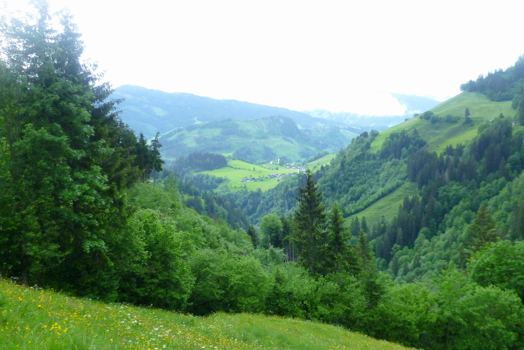 Sieben Stunden sind inzwischen vergangen, 35,6 km auf der Habenseite. Für noch gute elf km stehen satte drei Stunden zur Verfügung, das bekomme ich zur Not wandernd hin. Doch der Abstieg ist und bleibt herausfordernd. Eine hölzerne Siedlung mit offensichtlich kirchlichem Hintergrund erregt meine Aufmerksamkeit. Über u.a. gute Wiesenwege erreiche ich die letzte Labe bei km 39. Wieder muss das tolle Kuchenangebot herhalten, auch die Damen sind glücklich („Was magst Du haben?“ - „Zunächst ein Foto von Euch Hübschen!“). Im Tal ist Schwarzach bereits auszumachen, die drei markanten Sprungschanzen unterstützen bei der Orientierung. Siebendreiviertel Stunden sind vergangen, als endlich die 40 km auf dem Zeiteisen erscheinen. Sieben km in 2 ¼ Stunden sind auch für mich und selbst im jetzigen Zustand eine sichere Bank, eigentlich sollte ich die zehn Stunden deutlich unterbieten können. Aber die Wege sind nach wie vor nicht ohne.