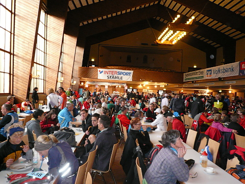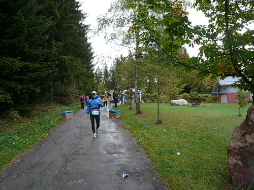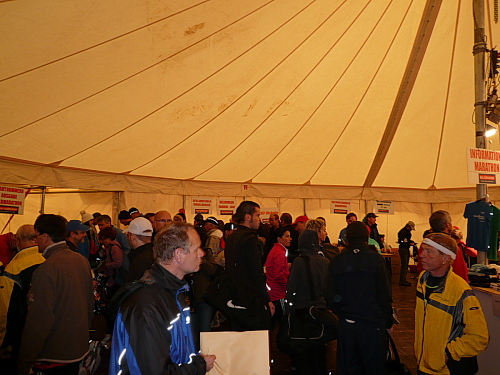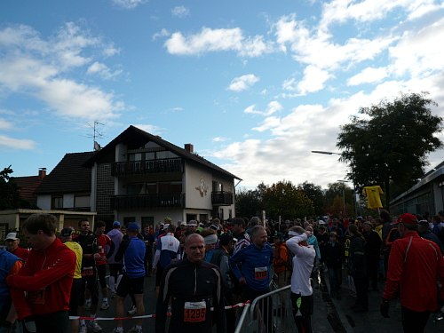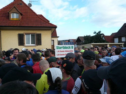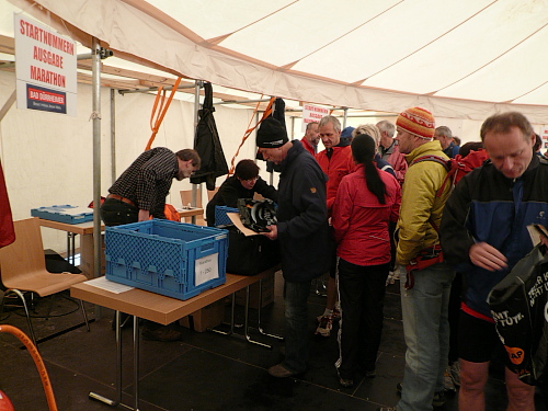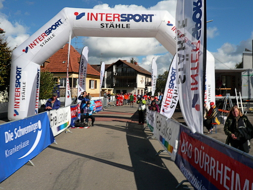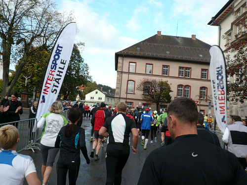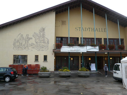Anlaufpunkt für alle Läufer, neben dem Marathon wurden auch noch ein Halbmarathon, 10 km-Lauf, Walking und Kinderläufe angeboten, war die Stadthalle in Bräunlingen. Aufgrund von Umbaumaßnahmen und dem damit verbundenen Platzmangel bekam ich meine Startnummer im Zelt vor dem Start- und Zielbogen. Neben der Startnummer erhielt jeder Teilnehmer noch ein Paar Laufsocken und einige Goodies. Umkleidemöglichkeiten waren in der nahe gelegenen Sporthalle, ebenso wie die Duschen für die weiblichen Teilnehmer, reichlich vorhanden. Die männlichen Teilnehmer wurden zum Duschtruck, der auf dem Parkplatz vor der Sporthalle stand, geschickt. Seine Siebensachen konnte man in einem Nachbargebäude der Stadthalle abgeben.