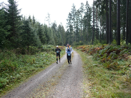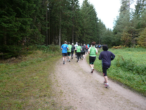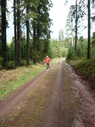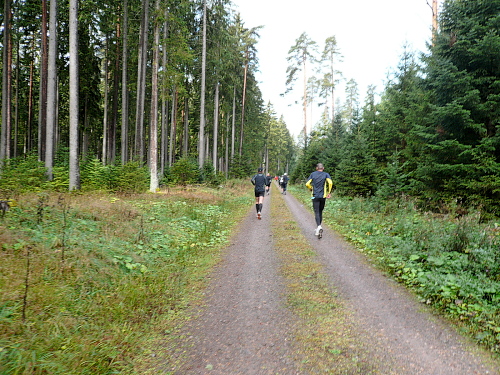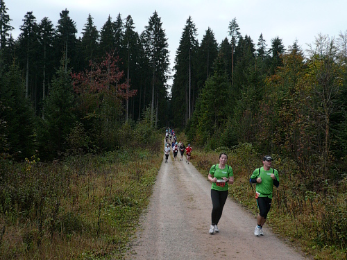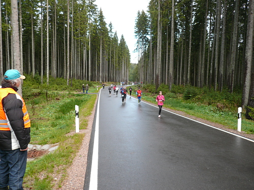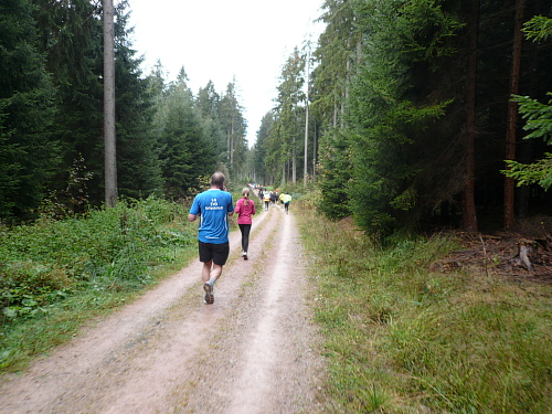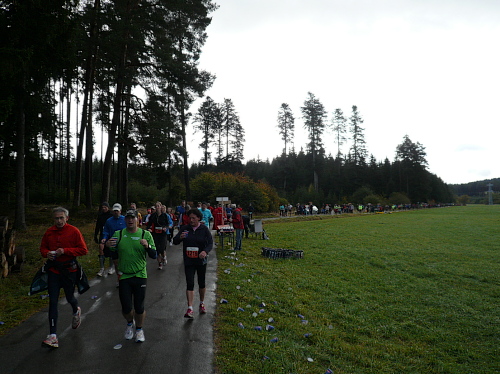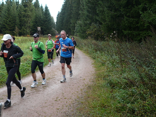 Ich entdeckte den 4:30 Stunden-Zugläufer vor mir und wollte mich an ihn ran arbeiten, um mich ziehen zu lassen. Irgendwie hatte ich das Gefühl, er würde schneller. Oder wurde ich langsamer? Wahrscheinlich von beidem etwas. Jedenfalls kam ich ihm nicht näher. Es ging nun leicht wellig durch den Wald und mittlerweile waren die ersten Läufer zu Wanderern mutiert.
