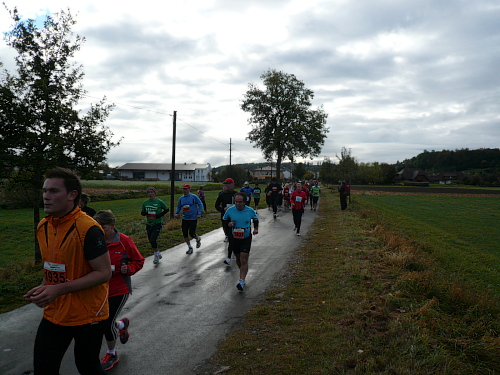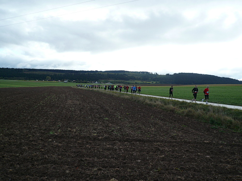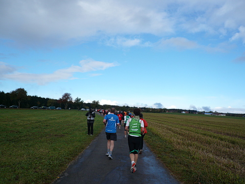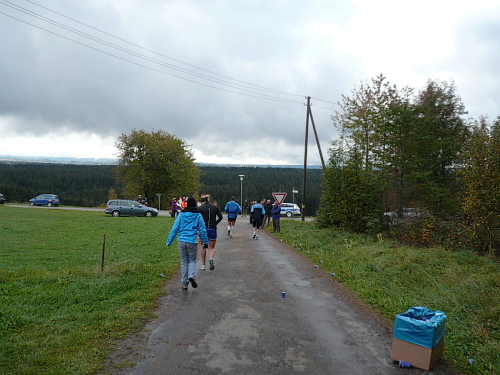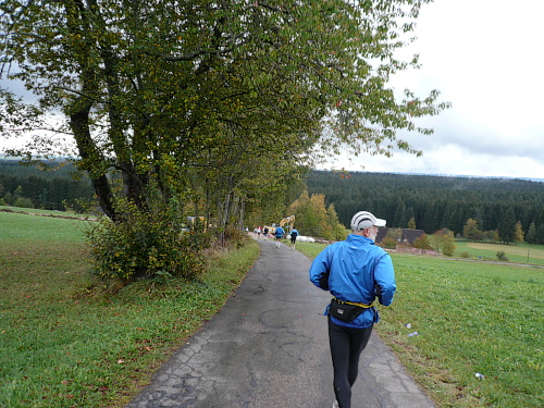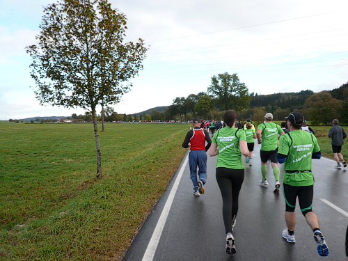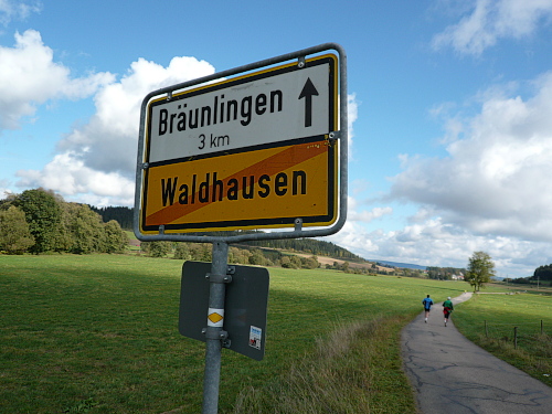Kurz vor Waldhausen kamen wir zur letzten Verpflegungsstelle. Für die letzten drei Kilometer gestärkt liefen wir auf dem Gemeindeverbindungsweg nach Bäunlingen, als ein rücksichtloser Autofahrer uns beinahe aufs Korn genommen hätte. Der Schreck war aber schnell überwunden und die Flüche ausgesprochen, als kurz vor Bräunlingen der letzte Kilometer eingeläutet wurde.