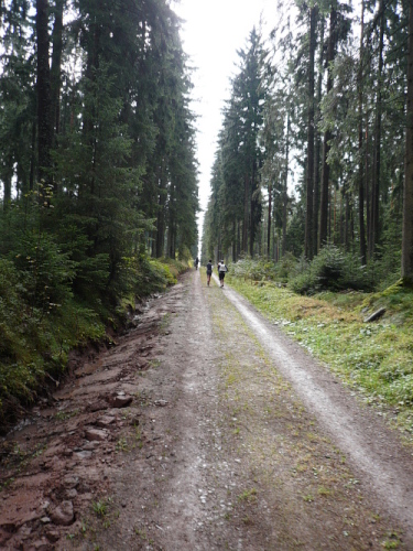 Nach dieser kurzen Erholung ging es aber gleich wieder bergauf und nach 12 Kilometern trennten sich Wege der Marathonis und der „Halben“. Lautstark wurden wir von den Helfern in die richtige Richtung dirigiert. Für uns ging es rechts ums Eck herum wieder auf die Waldwege.
