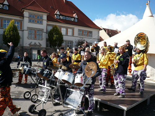 Noch einmal ging es über den Brändbach und dann durch ein Zuschauerspalier umjubelt ins Ziel. Die Blaskapelle hatte ebenfalls gute Kondition bewiesen. Seit unserem Start vor 4:30 Stunden waren sie engagiert bei der Sache. Kompliment.