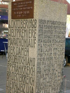Dreh- und Angelpunkt des „Events“ Schwarzwald-Marathon ist jedoch nicht das Rathaus, sondern die geräumige Stadthalle in Bräunlingen. Vor der Halle ist das mit vielerlei Fahnen ausstaffierte Start- und Zielareal aller Läufe angelegt. In einer Ecke des Areals entdecke ich die granitene Marathon-Stele, mit der allezeit der „Weltpremiere Frauenmarathon der Damen“ am 06.10.1968 gedacht wird und in der die Siegerinnen und Sieger seit damals durch Gravur verewigt sind. Schon ab dem frühen Samstagnachmittag ist vor und in der Halle richtig viel los. Die meisten Läufer kommen nicht lediglich zur Abholung der Startunterlagen bzw. zur Anmeldung, sondern bleiben, häufig von der Familie begleitet, und so herrscht in der Halle durchgängig bis in den Abend so etwas wie Festzeltstimmung. Viele kennen sich, der größte Teil der Teilnehmer stammt - bei aller propagierter Internationalität (Teilnehmer aus 30 Nationen sollen es sein) - aus der Region und viele nehmen, wie ich schnell feststellen kann, bereits zum x-ten mal teil.