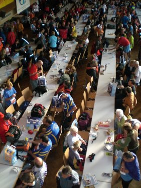 Bei einer kleinen Marathonmesse bietet sich die Gelegenheit, das Laufequipment zu vergünstigten Preisen aufzustocken, noch beeindruckender ist für mich allerdings das üppige Kuchenbuffet. Vor der Halle laden ein Biergarten und ein Kunst- und Handwerkermarkt zum Verweilen ein. Parallel zur offiziellen Eröffnung der „Nudel-Party“ starten zwischen 15 und 16 Uhr die ersten Laufwettbewerbe: der 10 km-Lauf und das 10 bzw. 21 km-Walking. Fast 800 Menschen nehmen daran teil und füllen nach vollbrachter Tat zusätzlich die Halle. Man muss schon ein Weilchen suchen, um da noch einen Sitzplatz in den langen Bankreihen zu finden.