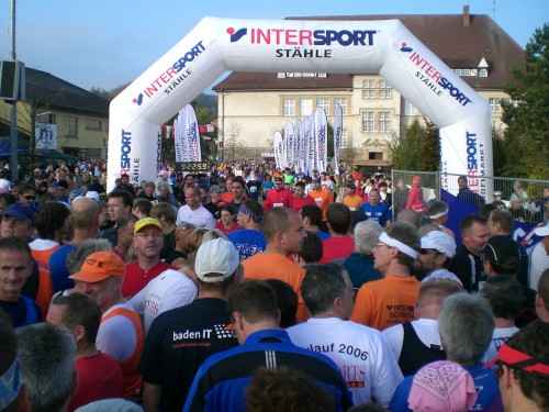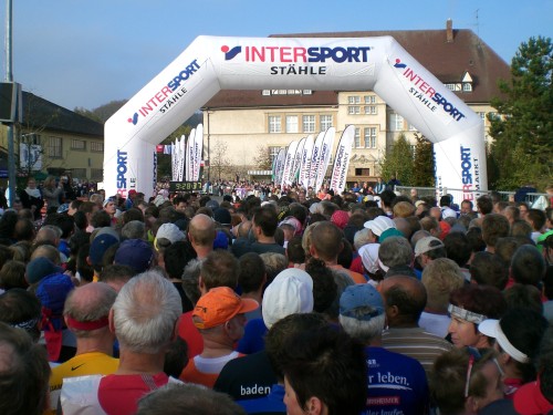Lautstark werden die letzten zehn Sekunden herunter gezählt, ehe mit dem Knall des Startschusses die Stecke freigegeben wird. Die ersten paar hundert Meter geht es auf breiter Straße durch den malerischen Ortskern Bräunlingens mit seinen alten Fachwerkhäusern. Auch wenn den Bürgermeister in seiner Festrede die „autobahnartige“ Dimension der Hauptstraße etwas beklagt hat – für die Startphase einer solchen Massenveranstaltung sind die Gegebenheiten einfach ideal. So entzerrt sich das Gedränge schon auf dem ersten Kilometer relativ gut. Der Applaus der bereits zahlreich an der Strecke stehender Zuschauer begleitet uns durch die Stadt.