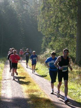Kaum ist die erste Hektik des Starts verflogen, sind wir schon draußen aus der Stadt. Auf asphaltierten Wegen zieht sich die Laufstrecke in langen Geraden durch offenes, nur unmerklich ansteigendes Wiesengelände. Weit reicht der Blick auf diesen ersten Kilometern über die offene, im Morgendunst scheinbar gegenstandslose Landschaft, in der der Wald nur schemenhaft am Horizont sichtbar ist. Fast schon ein wenig surreal wirkt das schier endlose schmale Läuferband, das sich durch die einsame, stille Szenerie windet.