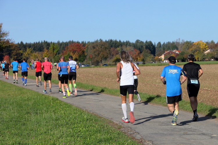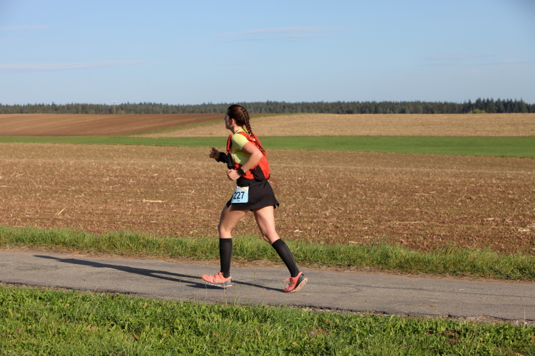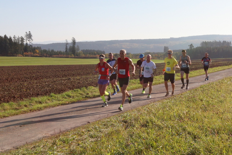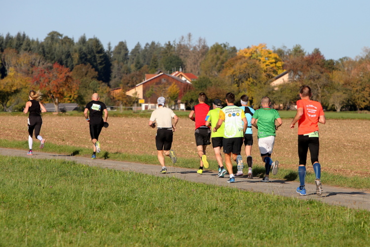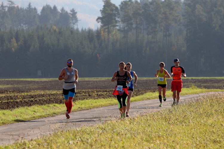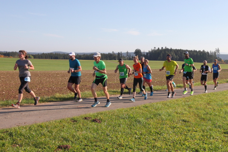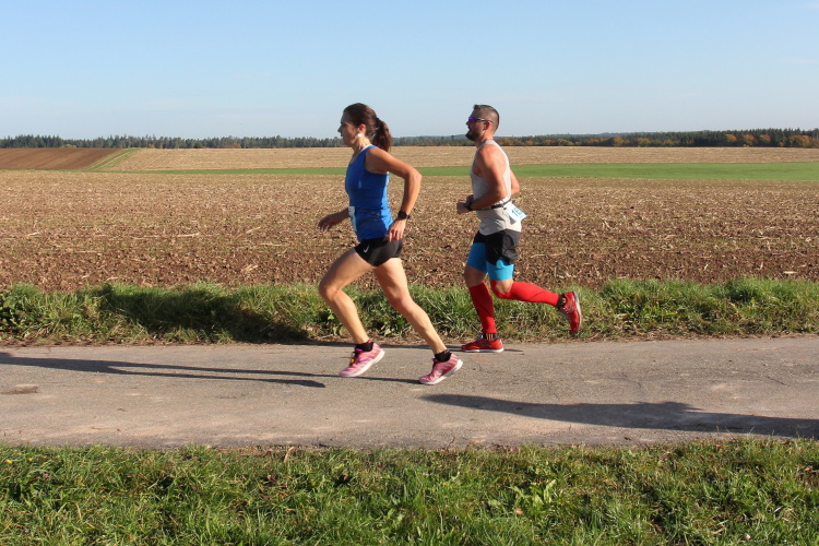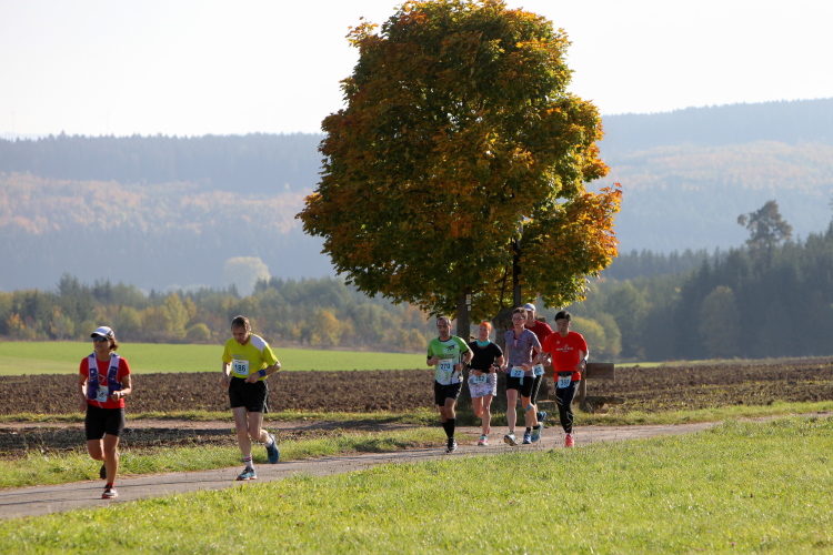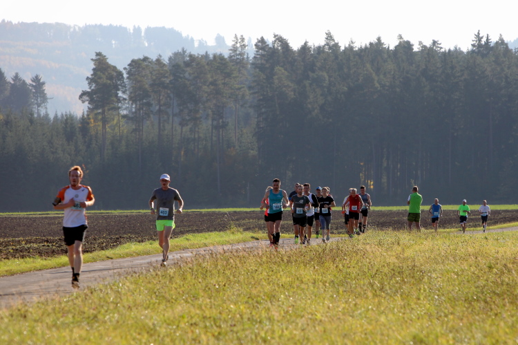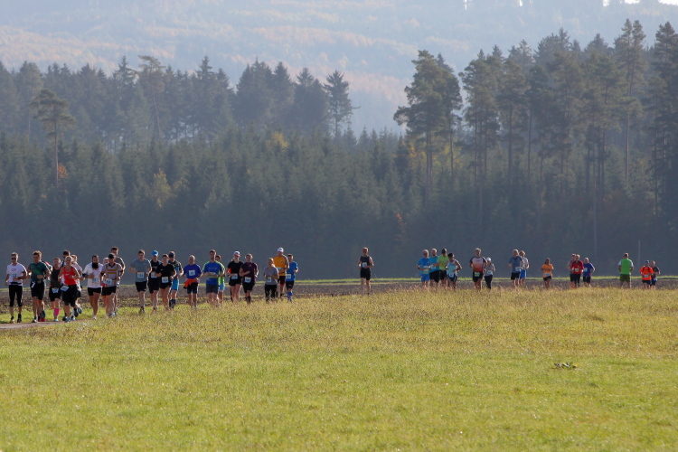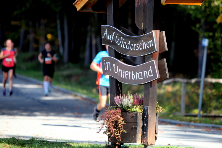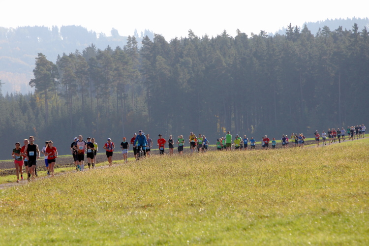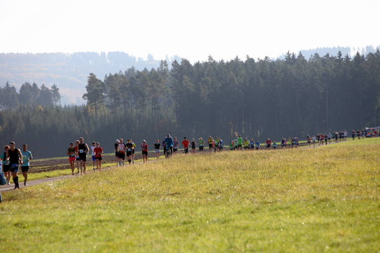 Die Streckentrennung von den Halbmarathonis führt uns wieder runter vom Asphalt. Während wir nach Westen laufen, schlagen die 21er schon wieder ihren Rückweg ein. Für sie geht es gerade weiter nach Oberbränd, wo sie sich nach zwei Kilometern wieder mit der Marathonstrecke vereinen. Bei den Staffeln ist hier der erste Wechsel fällig. Die Teilstrecken der einzelnen Läufer sind alle unterschiedlich lang, so kann man taktisch aufstellen. Das zweite Staffelmitglied hat nur 6,5 km vor sich, während der dritte Abschnitt mit 17 km der Längste ist.