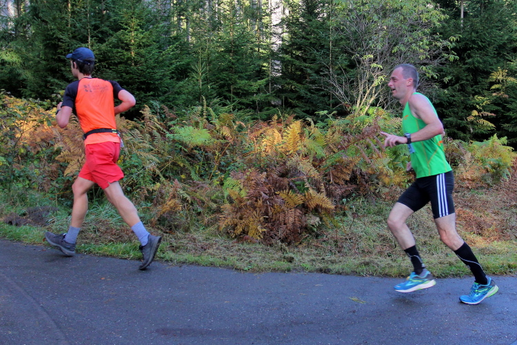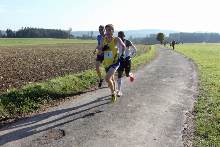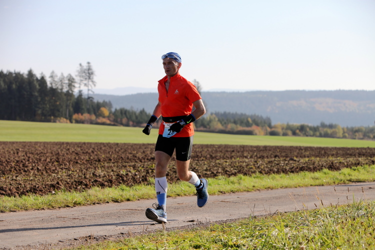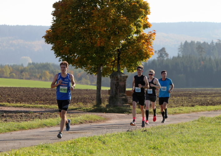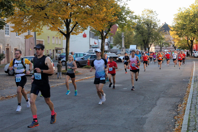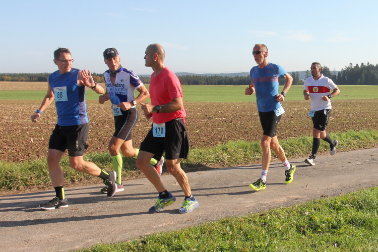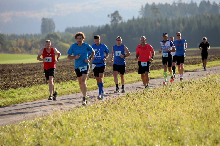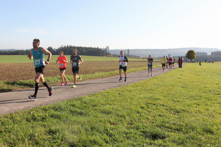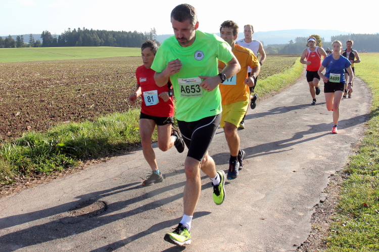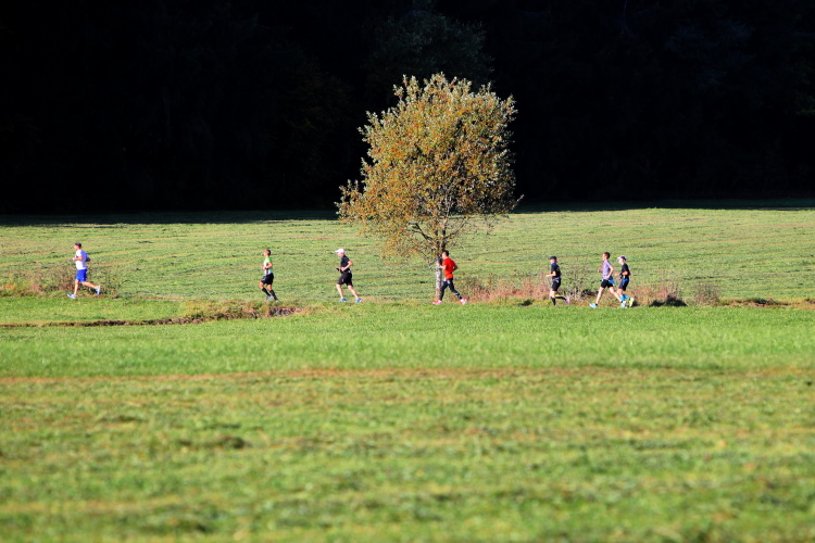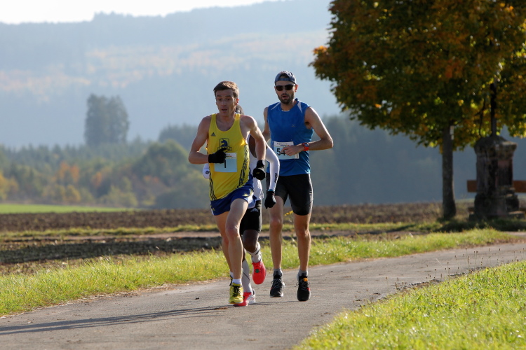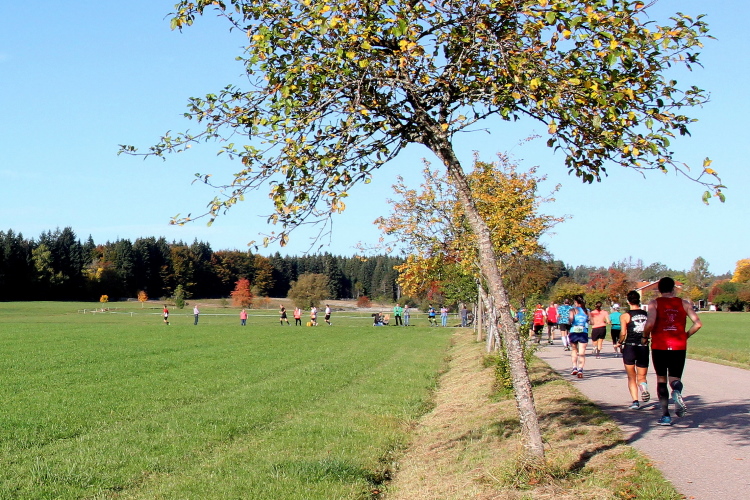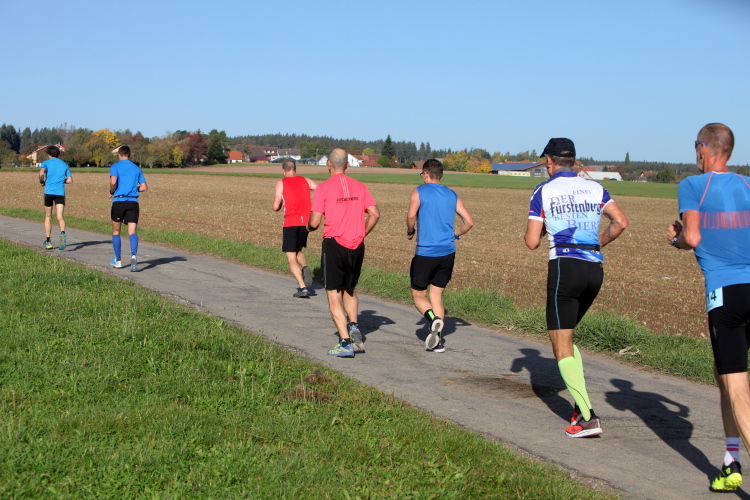 Die Streckentrennung von den Halbmarathonis führt uns wieder runter vom Asphalt. Während wir nach Westen laufen, schlagen die 21er schon wieder ihren Rückweg ein. Für sie geht es gerade weiter nach Oberbränd, wo sie sich nach zwei Kilometern wieder mit der Marathonstrecke vereinen. Bei den Staffeln ist hier der erste Wechsel fällig. Die Teilstrecken der einzelnen Läufer sind alle unterschiedlich lang, so kann man taktisch aufstellen. Das zweite Staffelmitglied hat nur 6,5 km vor sich, während der dritte Abschnitt mit 17 km der Längste ist.