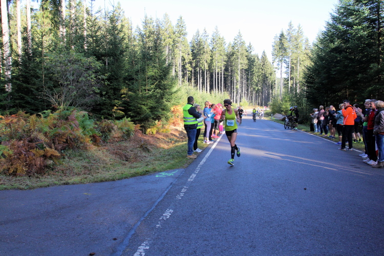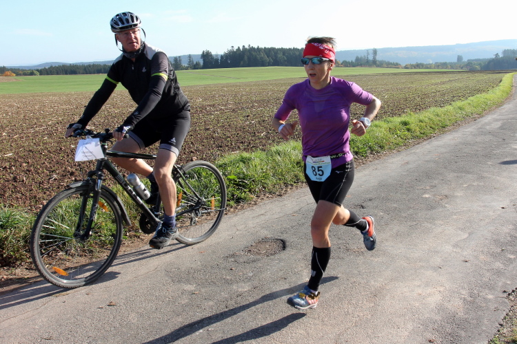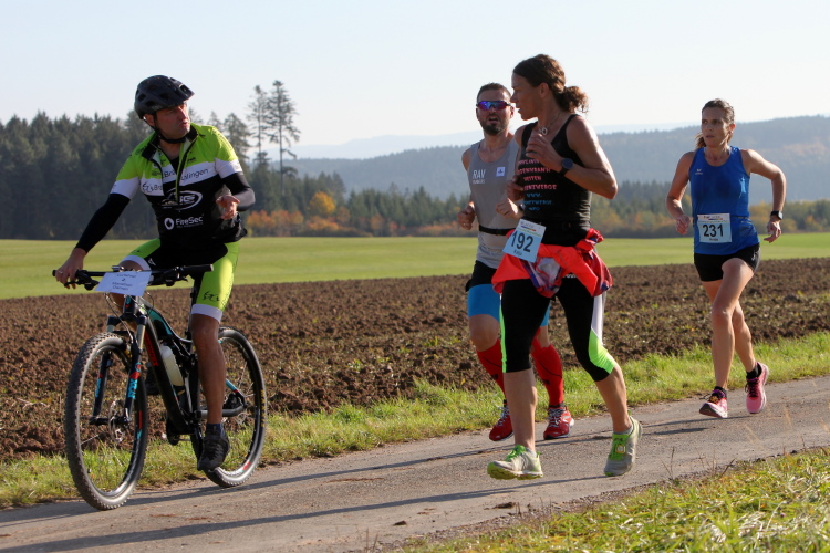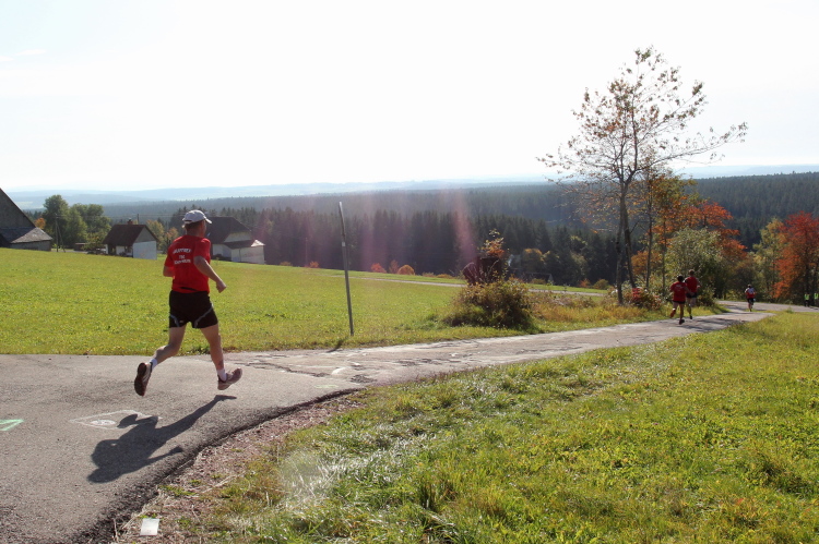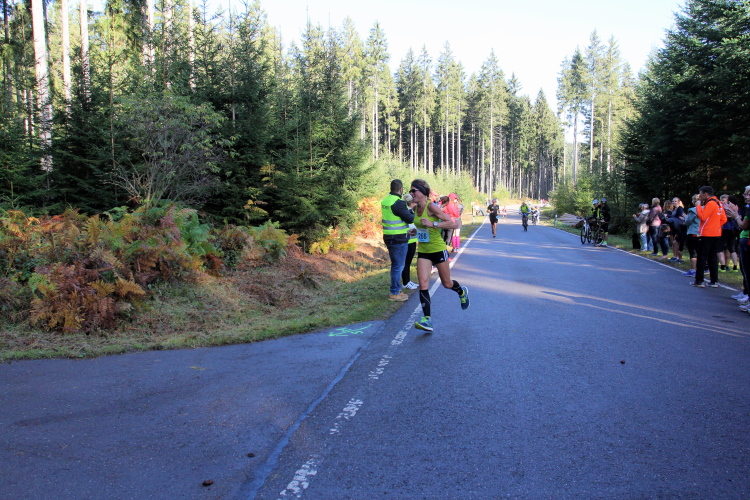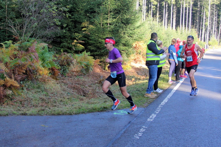 Vom Führungsradler bekommen wir die Meldung, Platz zu machen. 1:10 Stunden hat es gedauert, bis ich vom Führenden des Halbmarathon überholt werde. Wenig später biegen wir ab auf die Unterbränder Straße. 500 Meter dürfen wir auf der Teerstraße zurücklegen. In eine Senke geht es schön bergab, das Intermezzo ist aber nur kurz. Nicht immer optisch sichtbar, aber schon deutlich in den Beinen spürbar, geht es immer weiter aufwärts.
