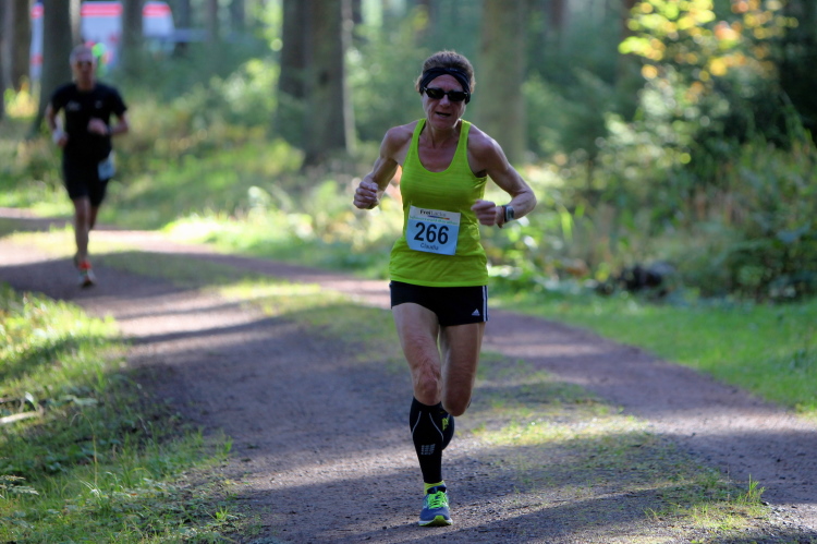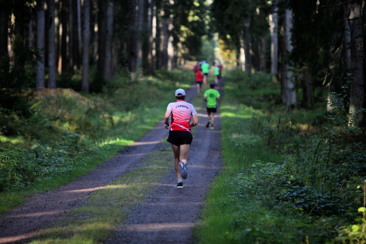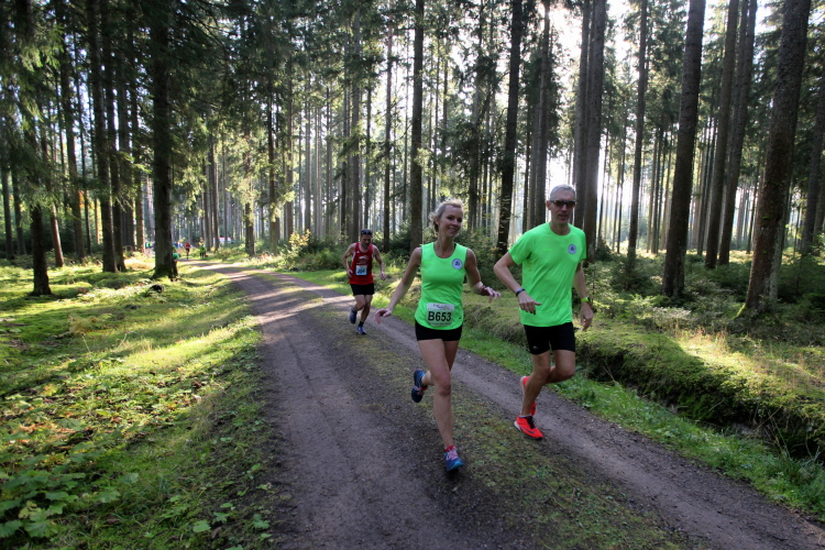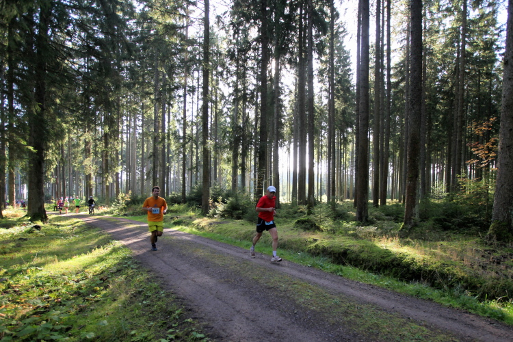 Ich komme mit Frank ins Gespräch, er bestreitet heute seinen allerersten Laufwettbewerb überhaupt, erzählt er stolz. Für seine Staffel legt er den ersten Abschnitt zurück, hat aber noch mächtig Respekt vor seinen 11,5 Kilometern. Als Ziel für sein Team sind Sub 4 ausgegeben. Na dann, viel Glück und natürlich in erster Linie viel Spaß. Etwas tiefer im Wald ist es wirklich wohl temperiert, bedeutend kühler als in der Sonne, es lässt sich sehr angenehm laufen. VP2 erreichen wir nach 10 km, wir können wieder Flüssigkeit aufnehmen. Der Tee ist noch schön warm, finde ich super.