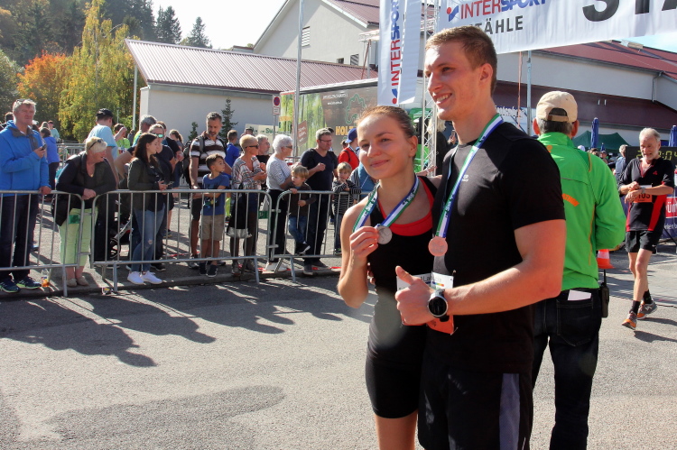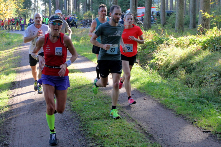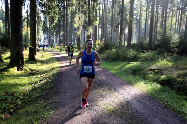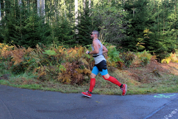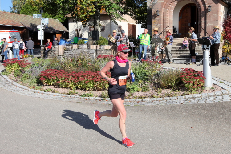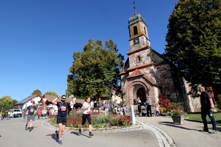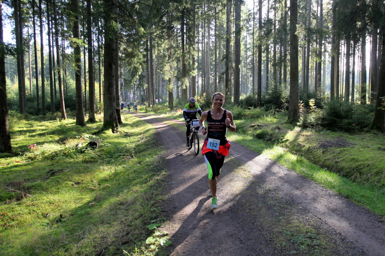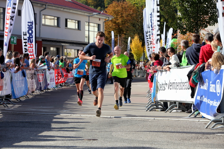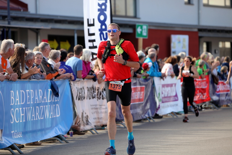 Nach ziemlich genau 38 km endet unser Ausflug durch den Black Forest, für ein paar Kilometer dürfen wir noch die Rückkehr des Sommers mit intensiver Sonneneinstrahlung genießen. Über eine halb abgesperrte Kreisstraße erreichen wir Waldhausen. Nach der letzten V-Stelle sind es noch dreieinhalb Kilometer. Über Asphalt geht es zurück nach Bräunlingen. Jede Menge Zuschauer empfangen mich auf der Zielgeraden vor der Stadthalle. Ich bin zufrieden mit meiner Zeit, vor allem aber mit dem herrlichen Erlebnis durch den Schwarzen Wald, der heute mit viel Sonnenlicht durchflutet gar nicht so dunkel war.