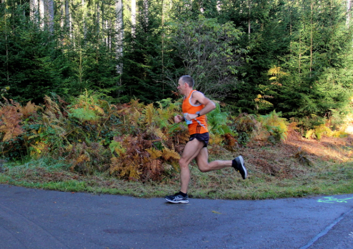 So ziemlich am westlichsten Punkt der Strecke ist mitten im Wald bei km 25 eine Zeitmessmatte zu überlaufen. Abkürzen ist also nicht so einfach drin und das ist gut so. Mein Chip funktioniert ordnungsgemäß, wie ich am lauten Piepsen vernehmen kann.