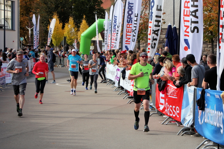 Countdown und los geht’s. An vielen jubelnden Zuschauern vorbei machen wir uns auf den Weg. Gleich biegen wir nach rechts ab in den historischen Stadtkern. Vorbei am Rathaus laufen wir auf das Mühlentor zu, das noch als einziges von vier Stadttoren der früheren Stadtmauer erhalten ist. Erbaut vermutlich um 1200 rum, brannte mal ab, wurde wiederaufgebaut und seitdem mehrmals umgebaut und renoviert. Jetzt ist es ein richtiges Schmuckstück. Kurz vorher biegen wir nach links ab und holen uns Gottes Segen ab. Den bekommen wir vom Pfarrer erteilt, der samt seiner Ministranten am Portal der Stadtkirche „Unsere Liebe Frau vom Berge Karmel“ steht.