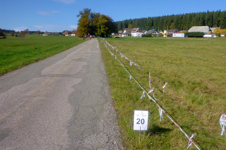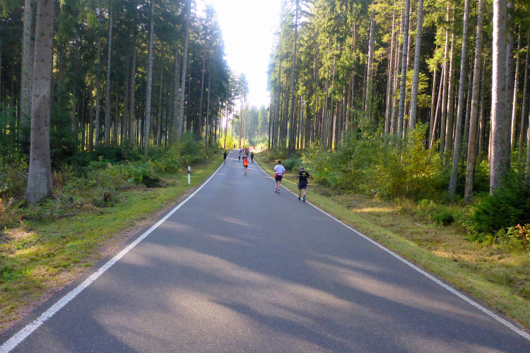 Wir biegen rechts ab in die Lange Planie. Im Schwarzwald haben alle größeren Waldwege Namen, die man an Holztafeln ablesen kann. Kontinuierlich steigt unser Kurs leicht an. Den höchsten Punkt der Strecke erreichen wir nach 16 km auf einer Höhe von fast 1.000 Metern. Etwas wellig geht’s noch weiter, bis wir kurz vor Oberbränd endgültig das meiste an Höhenmetern eingesammelt haben. Eine Getränkestation bietet sich für eine kurze Pause an. Erstmals werden Cola und dazu Laugenstangen angeboten. Von der Polizei gut abgesichert überqueren wir die Oberbränder Straße, für etwa 500 Meter geht es in die pralle Sonne weiter, dafür aber abwärts. Ein kurzes Stück sogar ziemlich kräftig.