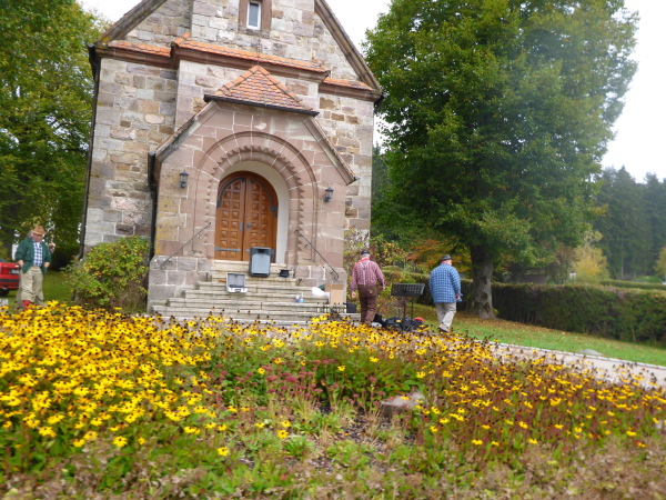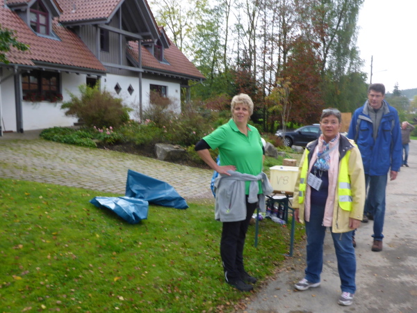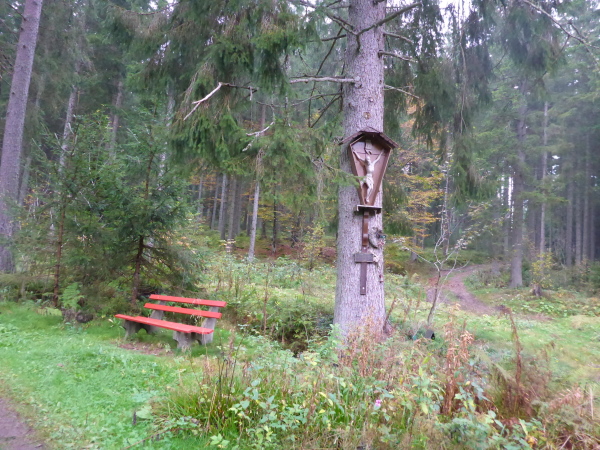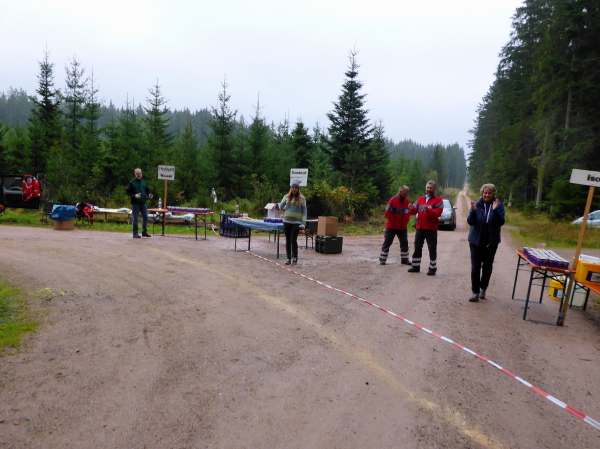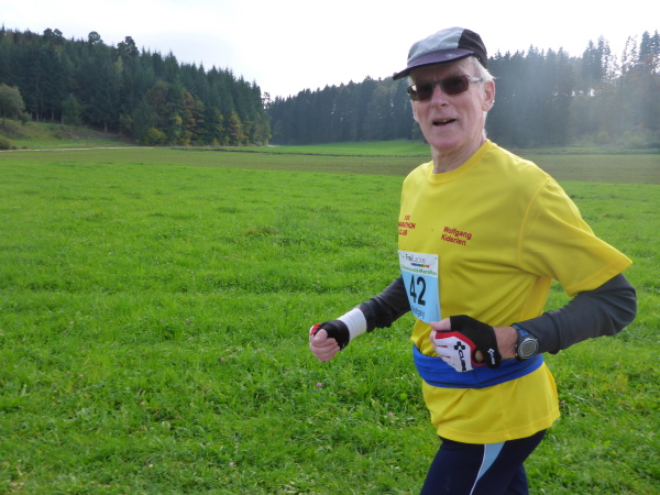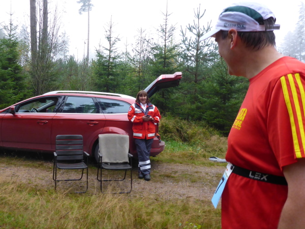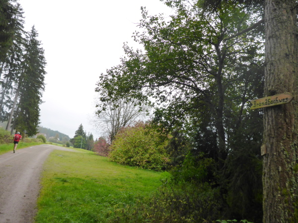 Der Wald hat sich unmerklich verändert. Die hohen Nadelbäume stehen weiter auseinander und so konnte sich am Boden üppige Vegetation entwickeln. Sogar kleine Blümchen kann ich entdecken. Der Wald tritt zurück und grüne Weiden mit den Häusern von Oberbränd liegen im Nebel. Kurz bevor wir den Ort erreichen, schicken uns die Streckenposten am Abzweig bei km 20 nach links. Es geht bergab und ein kalter Wind pfeift uns entgegen. Bald erreichen wir wieder den Wald. Die folgende Steigung wird nun auch von anderen gegangen. Oben stehen Mutter und Kind als Helfer. Der Kleine ruft uns zu: „Die Hälfte ist geschafft!“. Und tatsächlich kommt hinter der Kurve direkt das km 21 Schild.