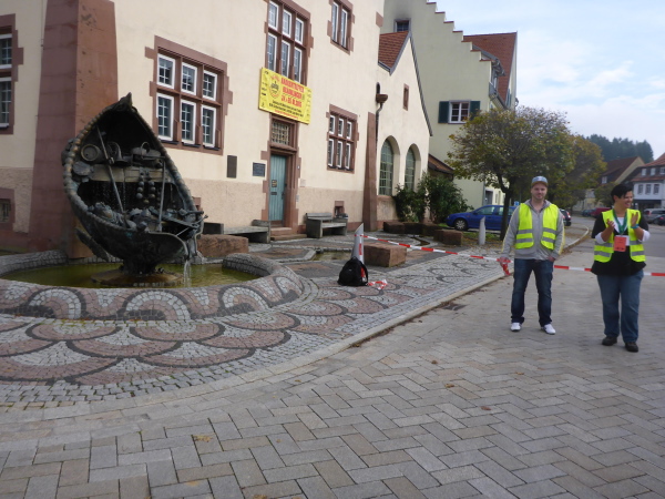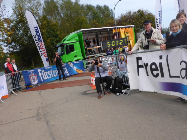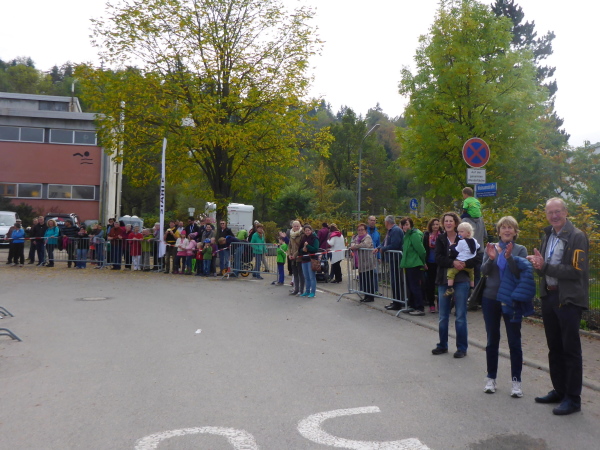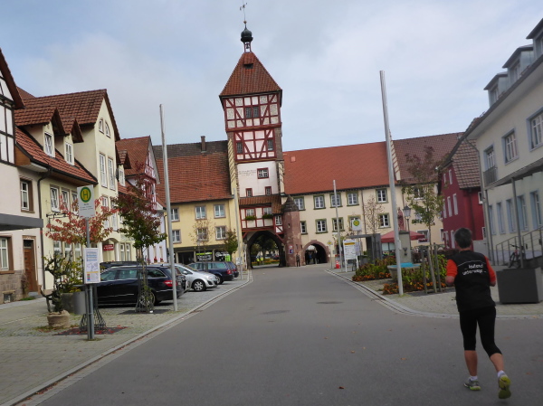 Wir laufen ein kurzes Stück gemeinsam, als ich noch eine weitere Frau vor uns sehe. Es ist nicht mehr weit bis ins Ziel. Am Narrenbrunnen feuern uns die Helfer an. Der Brunnen in Form eines Bootes symbolisiert im Narrenschiff das „Gemeinschaftliche“ der Narrenzunft Eintracht Bräunlingen. Schon liegt das Mühlentor vor uns. Die Dame vor mir stutzt. Wo müssen wir hin? Mir ist klar, dass es durch das Tor gehen muss. Da stehen auch schon Streckenposten. Aufgrund ihres kurzen Zögerns kann ich mit Schwung an ihr vorbeiziehen. Jetzt nur nicht nachlassen. Hinter der nächsten Kurve kann ich den Zielbereich erkennen. Dort sind jede Menge Zuschauer. Es folgt die letzte Kurve und dann das Ziel. Hier ist die Hölle los. Ich bin mitten in den Zieleinlauf des Bambinilaufs hineingeraten. Direkt hinter mir kommt schon Brigitte. Wegen ihres tollen Laufrocks wird sie vom Moderator gleich interviewt. Sie ist schon wieder bei Atem.