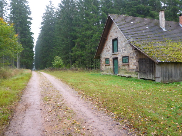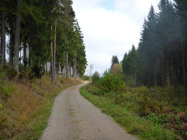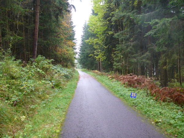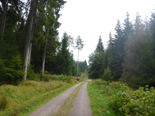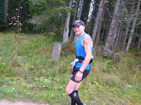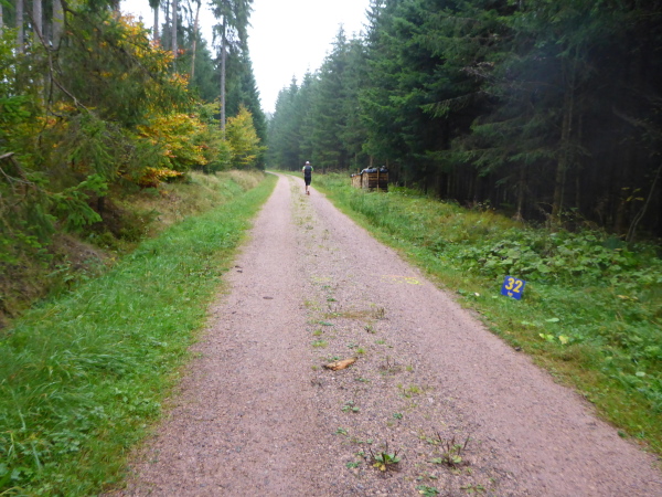 Jetzt wird es ruhig auf der Strecke. Meine Befürchtung, dass die großzügige Verpflegung dem Halbmarathon geschuldet ist, erweist sich als falsch. Auch unsere nächste VP ist üppig ausgestattet und mit sachkundigen Helfern besetzt. Endgültig allein unterwegs kann ich die Natur in vollen Zügen genießen. Der Südschwarzwald hat schon etwas. Der Weg führt durch hohen Nadelwald. Nebel liegt schwer zwischen den Bäumen. Rechts und links des Wegs gibt der mannshohe, schon braun gefärbte Farn dem ganzen einen herbstlichen Touch. Die kleinen blauen Kilometerschilder sorgen für Abwechslung und zeigen, dass ich, wie auch immer, vorwärts komme.