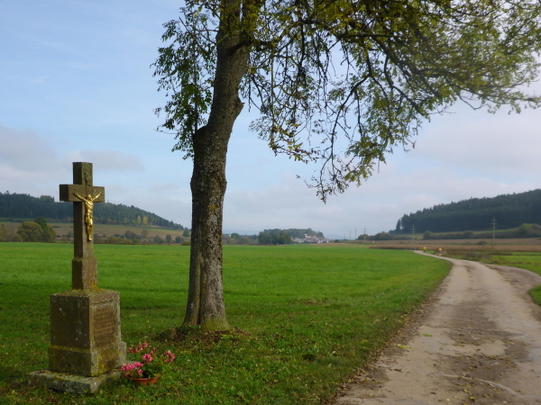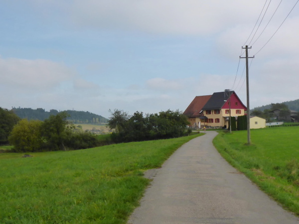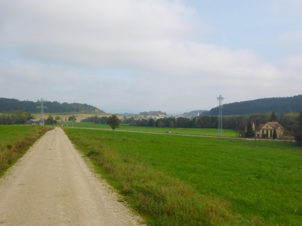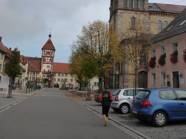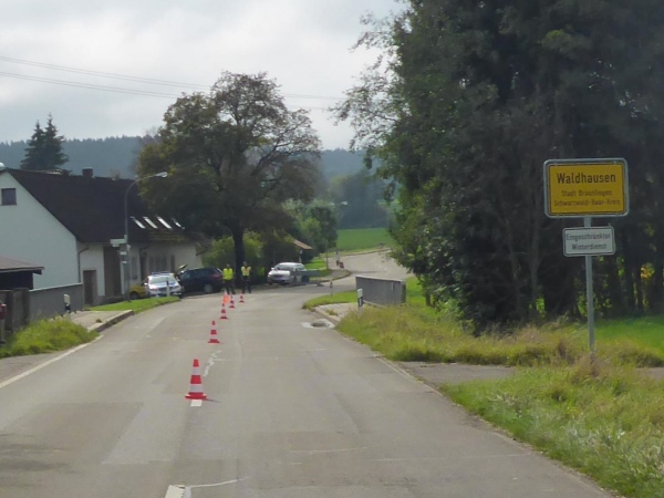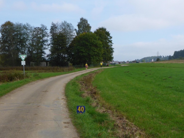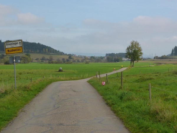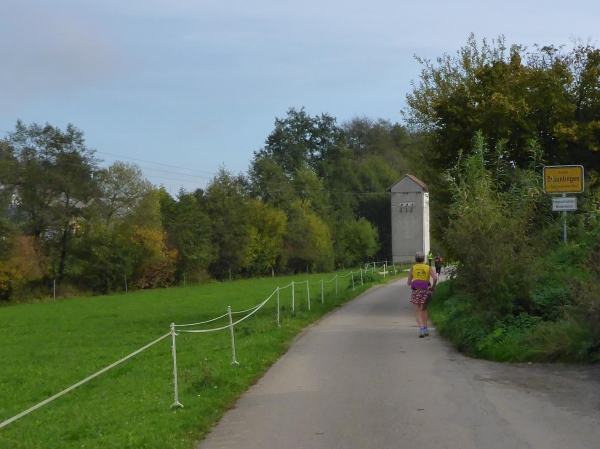 Der Weg führt aus dem Wald. Mittlerweile hat sich der Nebel doch tatsächlich aufgelöst und die Sonne kommt hervor. In weiter Ferne kann man bereits Bräunlingen erkennen. Erst geht es aber rechts auf die Straße nach Waldhausen. An der VP warten nochmals Iso, Wasser, Cola, Bananen und Laugenstücke. Ich habe mich wieder etwas erholt. Auf dem flachen Weg vor mir kann ich einige Läufer erkennen. Als ich so vor mich hin laufe, komme ich ihnen immer näher. Das motiviert mich zu letzter Anstrengung. Bis zum Ortsschild von Bräunlingen kann ich tatsächlich noch zwei von ihnen überholen und auch Brigitte kommt in Reichweite.