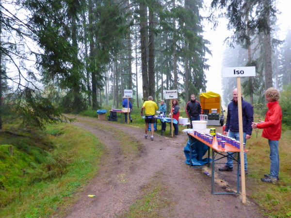Plötzlich Blaulicht mitten im Wald. Hinter km 17 parkt ein Krankenwagen. Keine Angst, es ist nichts passiert, er steht hier nur zur Vorsicht. Gleichzeitig muss so der scharfe Abzweig, auch vom unaufmerksamsten Läufer, erkannt werden. Die Verpflegung bei Oberbränd liegt im Nebel versunken. Hier sichern Helfer eine Straße und der 2. Staffelwechsel folgt. Auf dem anschließenden längeren Bergabstück kann ich nochmal auf meine verlorene Gruppe auflaufen. Dann wird es wieder flach und ich muss erneut abreißen lassen.