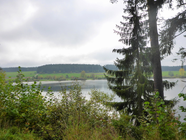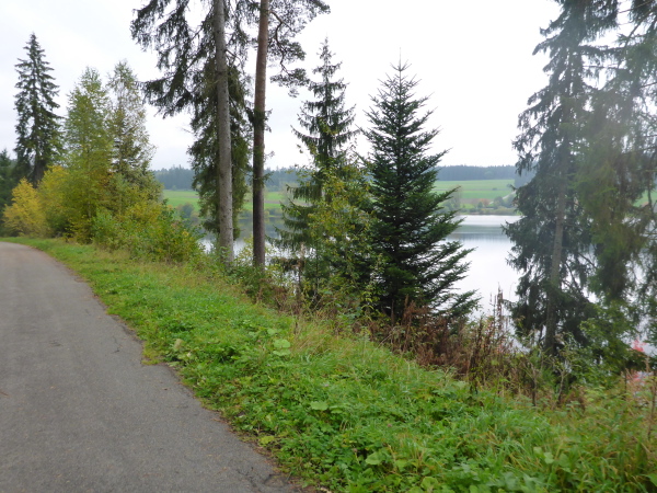 Ein wirklich netter, leicht abfallender Radweg macht das Laufen trotz der bereits gelaufenen Strecke angenehm. Bald erblickt man den beliebten Kirnbergsee zwischen den Bäumen. Der Weg führt oberhalb entlang und bietet eine schöne Aussicht auf den gegenüber liegenden Badestrand. Man sagt, dass Wasser sei im Sommer hier relativ warm. Der See wird auch von Wassersportlern aller Art gerne genutzt. Auch Angeln ist möglich. Heute ist er allerdings verwaist, was sicher den zahlreich vorkommenden seltenen Wassertieren und -pflanzen entgegen kommt.