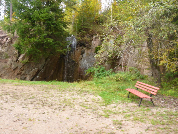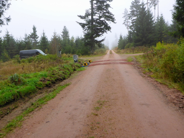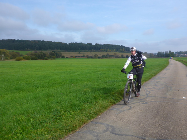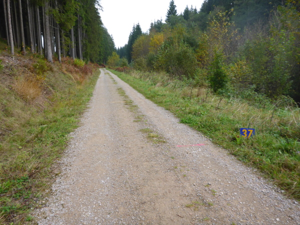 Die Kilometer ziehen sich etwas. Zwei Fußkranke kann ich überholen, dann gibt es schon wieder etwas zu essen. An der VP bei km 30 wird nun auch Cola ausgeschenkt. Es folgt ein matschiger Abschnitt. Nanu, wo kommt denn das Wasser her? Dann wird es sogar richtig trailig. Das kurze Stück bergab macht richtig Laune. Unten geht es über eine alte Holzbrücke und dann an einem kleinen Bächlein entlang. Hier bin ich froh, dass die Strecke wirklich super markiert ist. Jeder Abzweig ist mit Sägespänen und Flatterband abgesperrt, das zwar wegen Fahrradfahrern auf dem Boden liegt, aber trotzdem sehr gut sichtbar ist.
