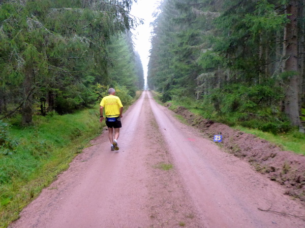 Den nächsten scharfen Abzweig kündigt abermals schon von weitem ein parkender Krankenwagen an. Der Helfer meint, es ginge nun tendenziell bergab. Tatsächlich fühlt es sich plötzlich leichter an. Langsam kann ich auf die mittlerweile ebenfalls versprengten Kollegen auflaufen. An der VP bei km 24 gibt es zusätzlich Laugenstangen, die bereits in mundgerechte Stücke geteilt sind. Wir stärken uns ausgiebig. Die Helfer sind gut gelaunt, hätten aber gerne etwas Sonne. Ich dagegen bin froh über die perfekten Laufbedingungen und kann auf Sonne gern verzichten. Kurz vor km 25 gibt es eine Zwischenzeitmessung quer über dem Weg. Bis hierher habe ich knapp drei Stunden benötigt.
