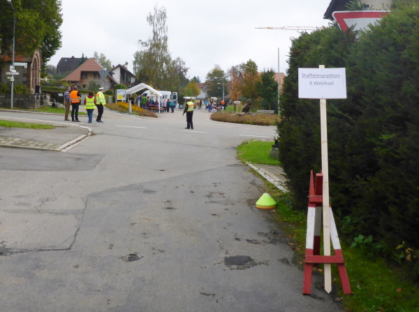 Bei km 34 erreichen wir Unterbränd mit dem 3. Staffelwechsel. Hier stößt auch die Halbmarathonstrecke hinzu. Die Läufer sind jedoch längst durch. An der VP werden die Laugenstangenstücke sogar mit Banane gefüllt - Läufersandwich. Es gibt wieder Cola und den Hinweis, dass es nun nur noch bergab geht.
