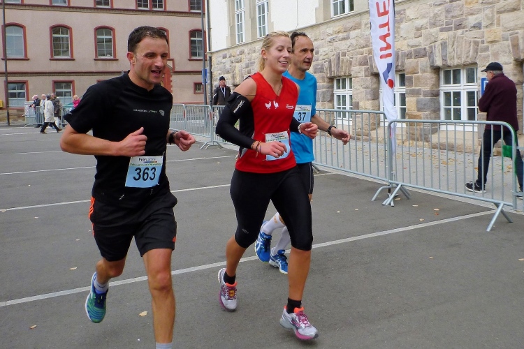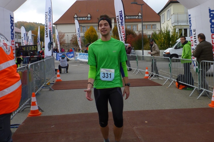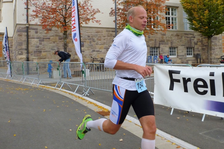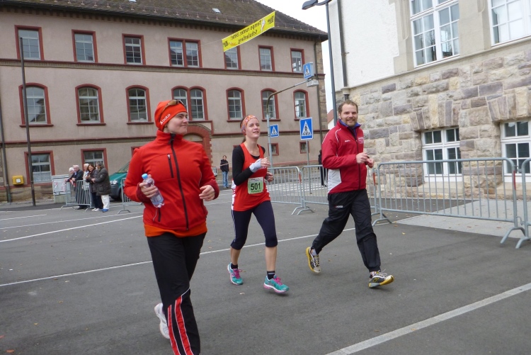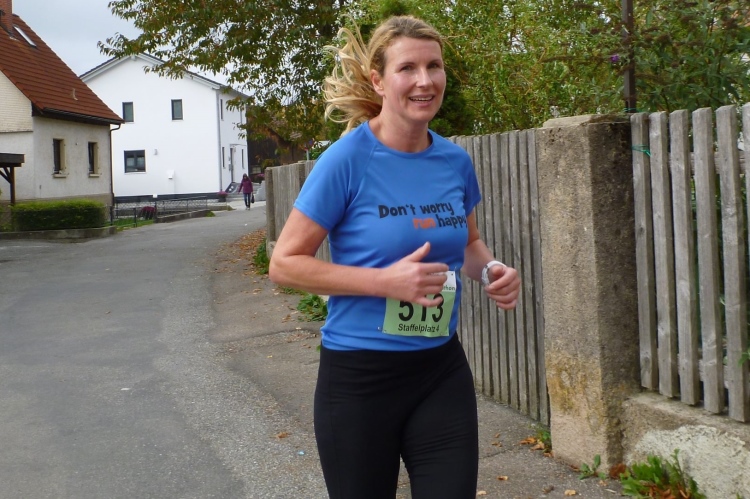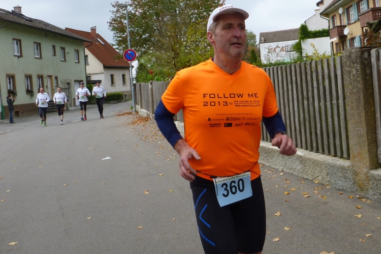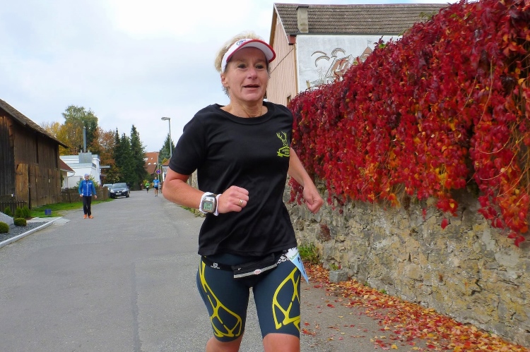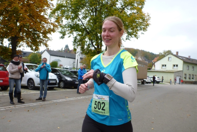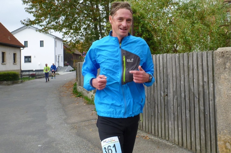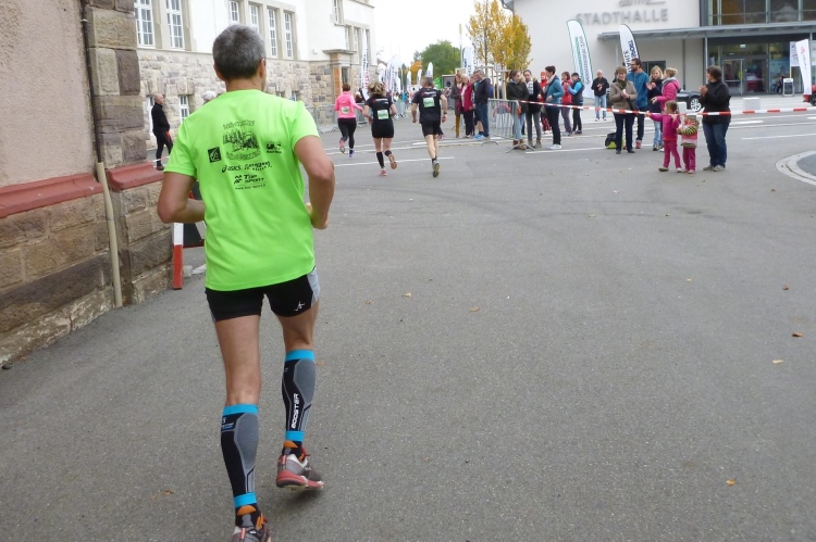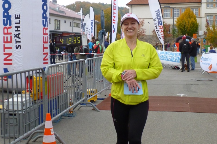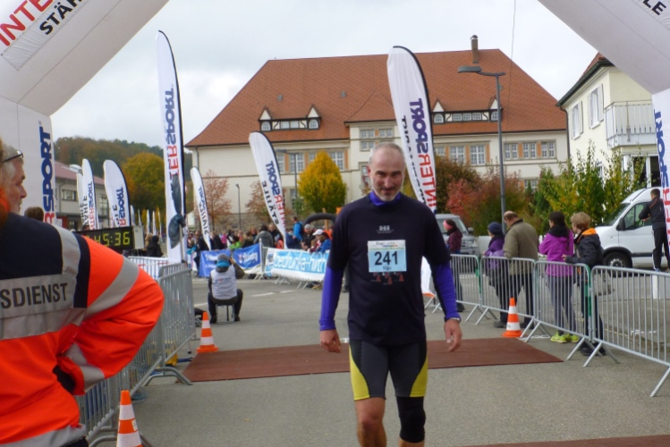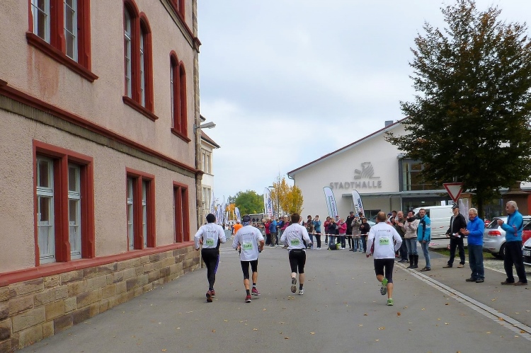 Bis zum Ortseingang kann ich noch zwei weitere Läufer einholen, dann höre ich schon den Moderator. Es geht über den Röthenbach und dann laufen wir am Grabenring entlang, dahinter war früher die Stadtmauer. Wie weit denn noch? Ein Staffelmensch hat noch zu viel Kraft, der spurtet wie ein 100-Meter-Läufer. Es geht leicht links herum, ich erkenne die Stadthalle und dann im nächsten Moment das Zieltransparent. Auf der Uhr lese ich 3.44 Stunden ab. Maßarbeit. In der Nettozeit bin ich sogar noch darunter. Gut ist es gegangen.