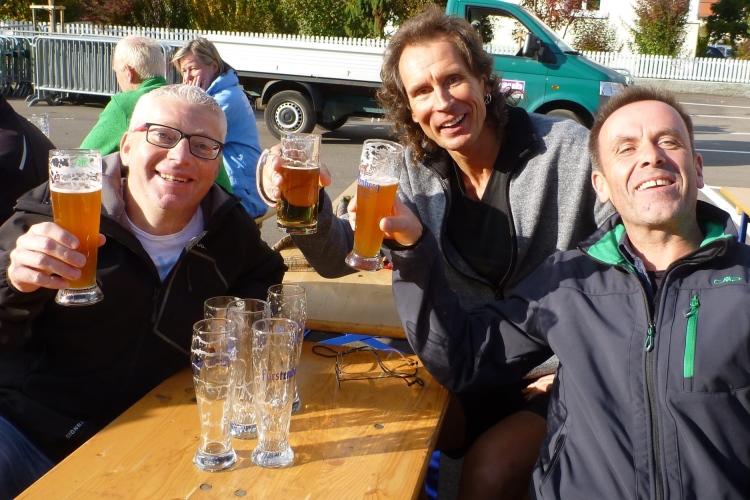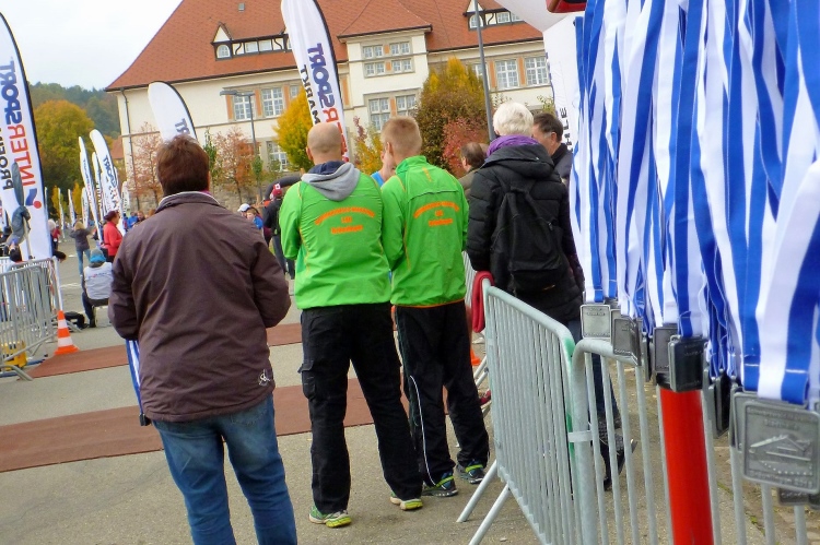 Ich erhalte die Medaille überreicht, die als Motiv die in diesem Jahr neu eröffnete Stadthalle hat. Ein paar Meter weiter gibt es Bananen, Tee und Iso in gelber, rosa und grüner Farbe. Bei meinen Frage nach Freibier lacht der Helfer: „Dofür brausch Geld!“ Ja, haben die Brauer von Fürstenberg und der Löwenbrauerei kein Mitgefühl mit einem durstigen Bayern und den anderen Läufern? Dafür bietet das Kuchenbuffett in der Stadthalle auch noch am Nachmittag eine reiche Auswahl.