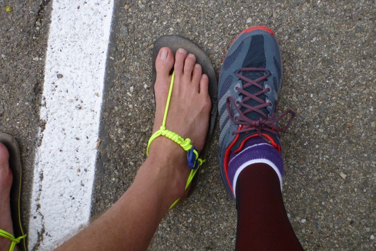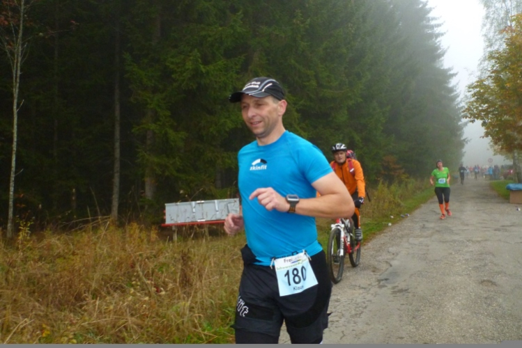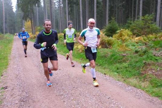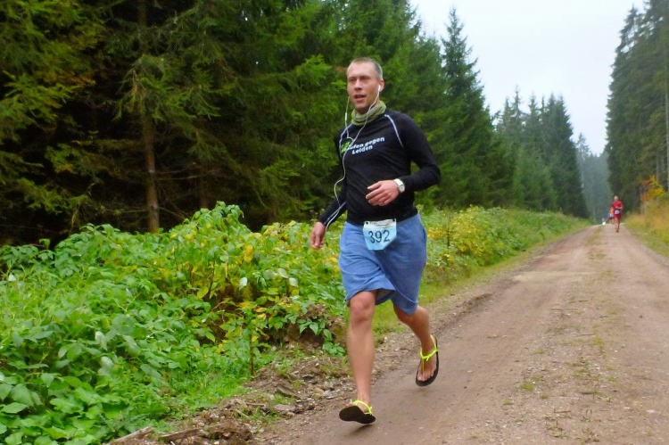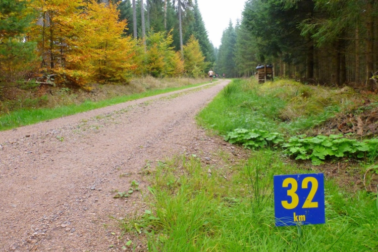 Bei Kilometer 25 steht ein Fahrzeug der Zeitmessfirma. Die Helfer haben sich in das warme Auto verzogen. Beim Überlaufen der Matten hören wir das Piepsen und sind sicher, wir sind erfasst. Seit ein paar Minuten höre ich von hinten deutlich einen Schlappschritt. Und dann kommt auf der Fuchsbau Allee (ja, so heißt der Forstweg wirklich) Thomas Baumann angelaufen. Mit Jesus-Schlapperl, an denen dünne Riemen verhindern, dass das Schuhwerk davonfliegt. Kilometer 32, noch zehn, 2.55 Stunden bin ich jetzt unterwegs. Ich rechne, da könnte sogar noch etwas in Richtung 3.45 Stunden gehen. Aber ich darf nicht trödeln. Auf der anderen Seite, einige Bilder bräuchte ich schon noch. Denn trotz des Nebels ist es schön hier.