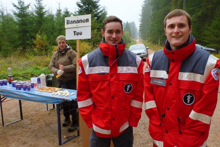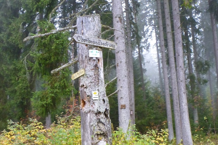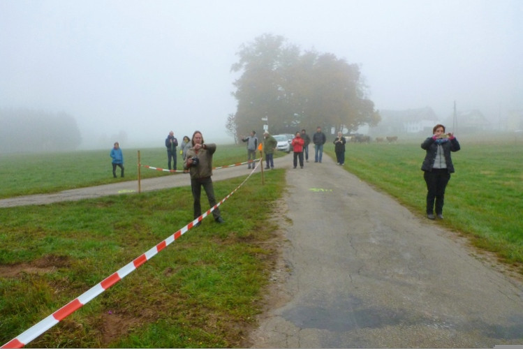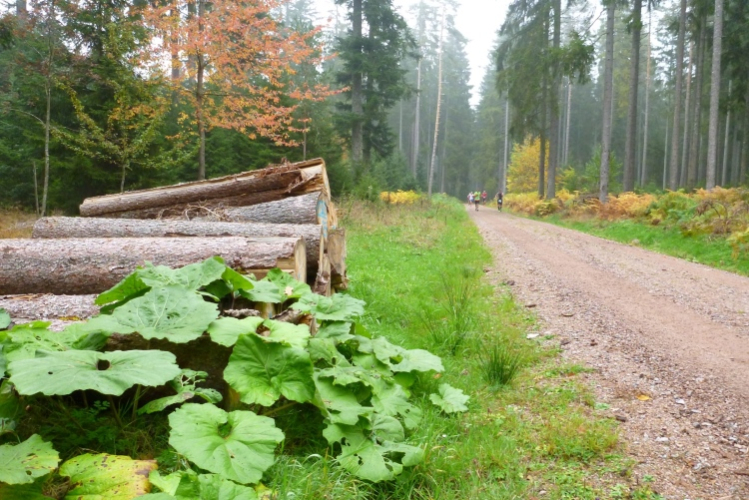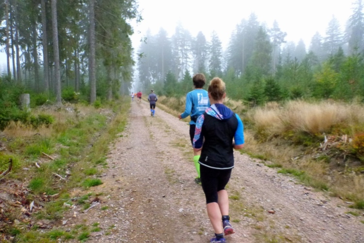 Hier ist der erste Staffelwechsel, viele Staffeln sind jedoch nicht zu sehen. Man kann sie an der Rückennummer erkennen. Es kann also nicht passieren, dass du dich von einem frischen Staffelläufer irritieren lässt. Die Lange Planie und der Oberbrändbachweg bringen uns auf den ersten Höhepunkt, wir sind nun knapp 1000 Meter hoch. Die Temperatur liegt deutlich unter zehn Grad. Die wenigen Spaziergänger sowie einige Helfer hantieren schon mit Handschuhen. Der fast mannshohe, teilweise schon etwas dürre Farn gibt dem Drumherum einen herbstlichen Touch. Der Nebel hängt nun fast bis zum Boden herunter, Sicht etwa 100 bis 200 Meter.