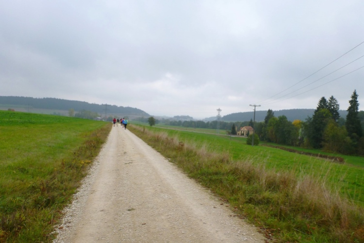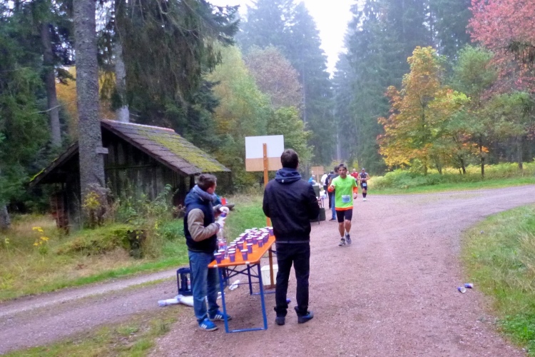 Auf dem Ameisenrundweg verlassen wir wieder den Wald, Unterbränd ist bereits zu sehen. Dieter Pflüger aus Süßen bekommt meinen Schwung mit. „Du Temposau,“ ruft er noch hinterher. An der Ortskirche spielen gerade fünf Musiker für ein paar Zuschauer und für uns. Ich verpflege kurz, nehme zum ersten Mal einen Schluck Cola und mache mich auf den weiteren Weg. Der anfangs geteerte, später gut befestigte Wanderweg macht das Rennen leicht. Wegen dem leichten Gefälle rollt es fast von alleine, trotz der 36 bereits gelaufenen Kilometer.