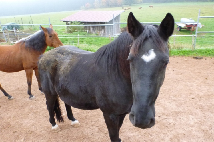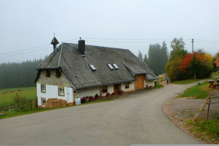 Oberbränd, Kilometer 18. Die vierte Tanke liegt am Waldrand im dichten Nebel. Der zweite Wechselpunkt der Staffeln. Helfer sichern die Straße ab. Jenseits geht es steil hinunter, zu steil für meine Muskulatur. Einige brettern da hinunter ohne Rücksicht auf Verluste. Oberbränd liegt in einer Lichtung, man hat schöne Ausblicke. Zwei Pferde, eines kommt für eine kurze Krauleinheit sogar ans Gatter, ein kleines Feldkreuz, ein einzelnes Bauernhaus mit typischem Walmdach.