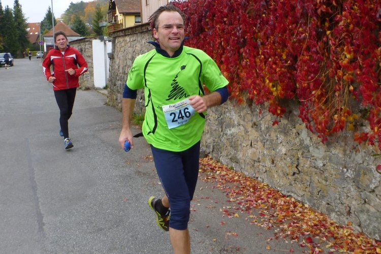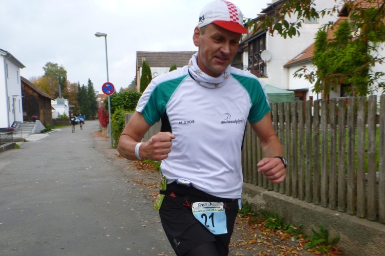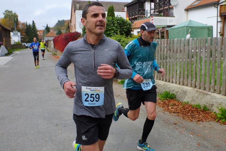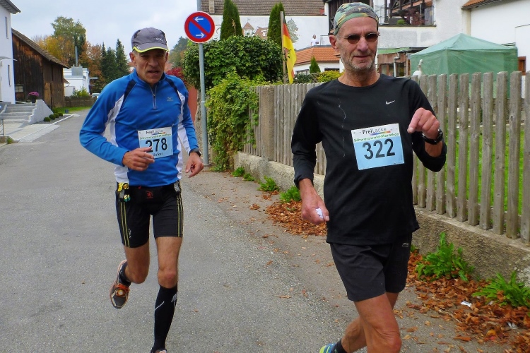 Auf einer halb abgesperrten Kreisstraße erreichen wir Waldhausen. Noch drei Kilometer. Die letzte V-Stelle lasse ich links liegen. Eine nochmalige Verpflegungsaufnahme bringt nichts mehr. Ich starte durch. Es wird knapp mit 3.45 Stunden. Am Ortsausgang erkenne ich bereits die Silhouette von Bräunlingen. Und dann sehe ich den Ulrich, der mir vor 35 Kilometer davongerannt ist. „Du hast ja richtig Gas gegeben“, stellt er fest und schickt mich nach vorne.