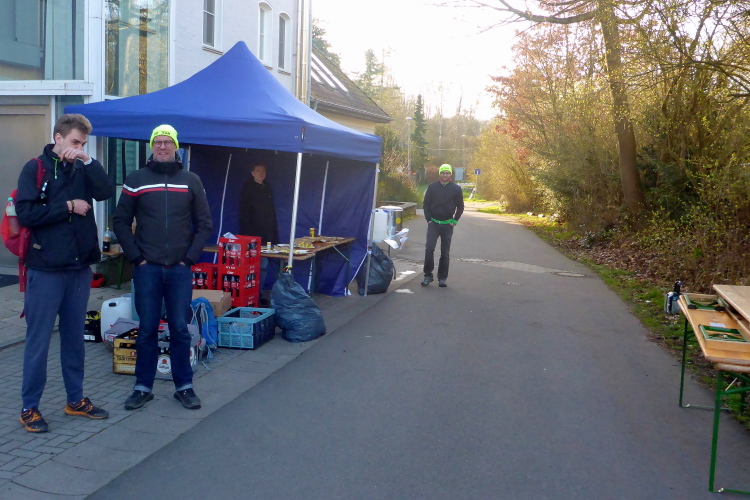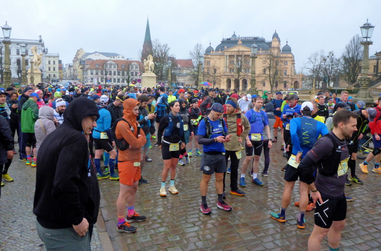 Leider prasselt gerad ein Regenschauer auf das Turnhallendach und wird uns einen nassen Start bescheren, also direkt die Regenpelle an. Nicht so schön, aber die Ankündigung, dass es danach trocken bleiben soll, macht Hoffnung. Radbegleitungen sind erlaubt, müssen aber an einigen Stellen die Strecke umfahren. Angekündigtes Totholz wäre hier unüberwindbar. Wer möchte, kann ein Drop-Bag zum VP4 bei km 36,4 bringen lassen.