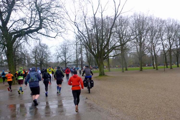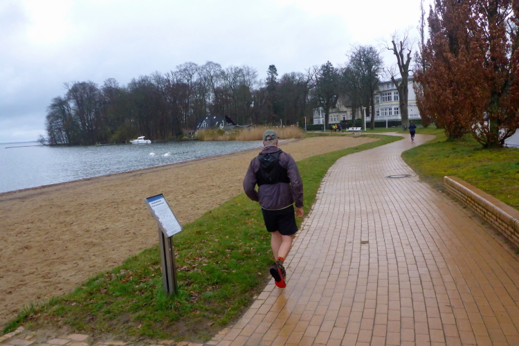 Es werden schnell noch Fotos geschossen, dann schickt man uns auf die Runde um den gesamten Schweriner See. Es geht kurz durch den Schlosspark und schon biegen wir auf einen Radweg ein. Irgendwie passt das nicht, wir sind auf einem Trail und folgen einen topfebenen Asphaltband. Mal abwarten, was da noch kommt. Ich komme mit einem Läufer ins Gespräch, er ist auf seinem ersten Ultra und wir quatschen ein paar Kilometer platt. Es geht teils gepflastert, teils sehr fein befestigt und teils über Teer um die untere Seeseite herum, der Blick nach Schwerin auf der anderen Seeseite ist leicht vom Wetter getrübt. Wenigstens hört der Regen auf, aber es pfeift ein eisiger Wind. Ein kleiner Ausflug auf einen Singletrail sorgt für Abwechslung und beschert uns die ersten Höhenmeter. Beim bisherigen Verlauf der Strecke frage ich mich, wie wir überhaupt auf die angekündigten 470 Meter aufwärts kommen sollen. Aber wir sind ja noch am Anfang.