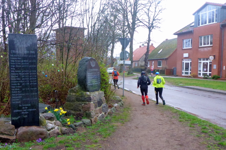 Nach 14 schnellen Kilometern bis zum Trailbeginn kommen ca. 4 km mit 10-12 Minuten Pace hinzu, dann geht es zurück auf den Asphalt und man kann sich die Lehmbrocken von den Schuhen laufen. Hinter dem zweiten VP in Leezen bei km 18,5 geht es weg vom See, bergauf und damit in den Wind hinein. Dafür ist es richtig erholsam, locker über Teer zu gleiten und Kilometer zu machen.