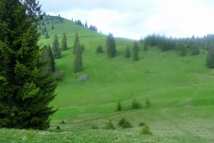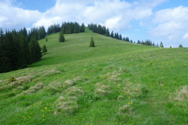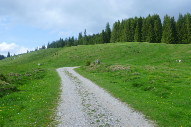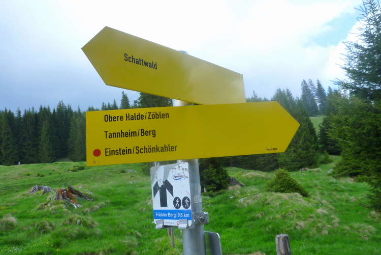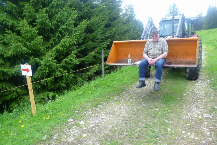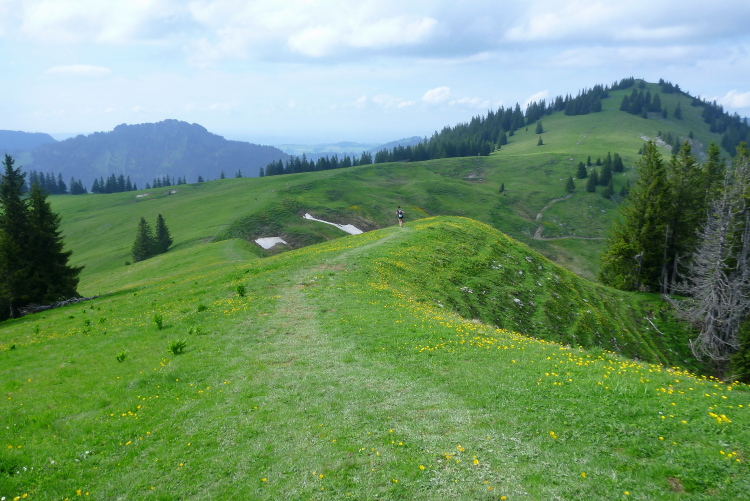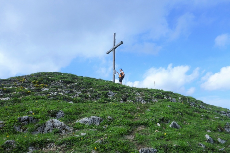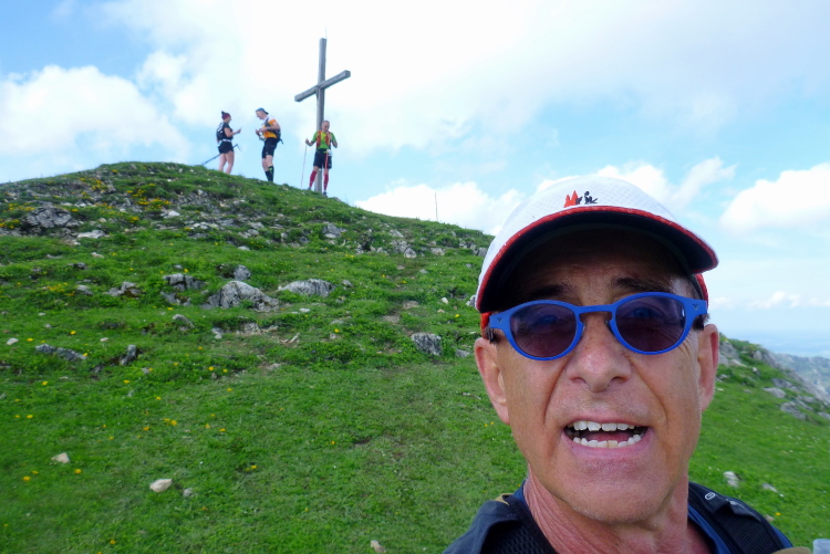 Weiter geht es auf diesem Schotterweg hoch, einer der zahlreichen Helfer verweist mich, in der Schaufel seines Baggers sitzend, grinsend scharf nach rechts. Zunächst durch Wald, dann über weite Wiesen, aber immer steiler werdend, verlangsamt sich meine Schrittgeschwindigkeit immer weiter. Stimmt, ein Gipfelkreuz hatte man uns angedroht, unzweifelhaft naht es. Kurz vor dem Schönkahler, so heißt der dazugehörige Berg, wird der 19. km in 14 Minuten mein langsamster. Waren die Aussichten bisher schon klasse, werden sie jetzt noch besser. Hammer! Aber auch der Wind, und der ist stark und ganz schön frisch. Mehrfach fürchte ich, glücklicherweise umsonst, um meine Schirmmütze. Der Weg durch die steilen Wiesen ist aber auch stark! Läufer kommen mir entgegen, weit kann es demzufolge nicht mehr sein.