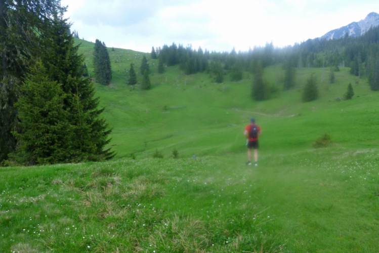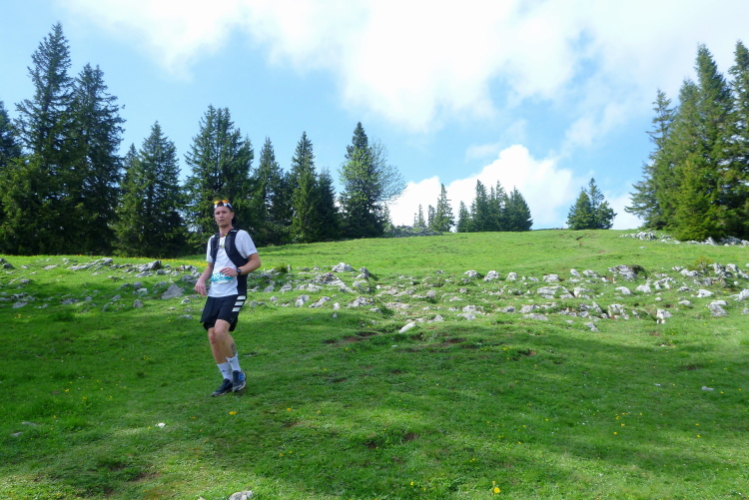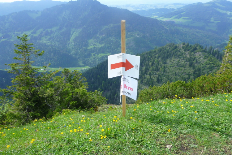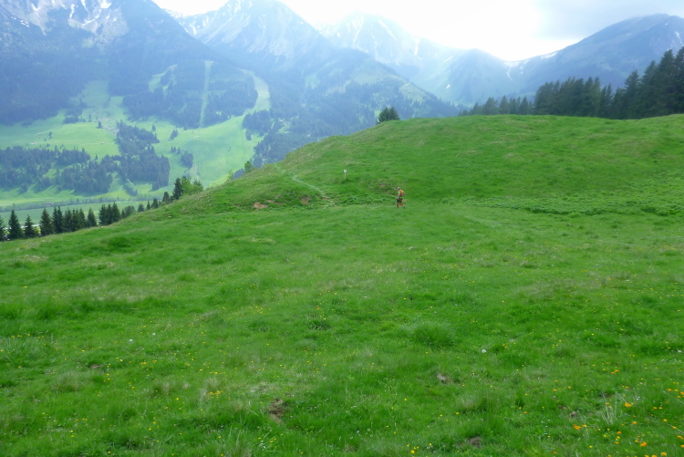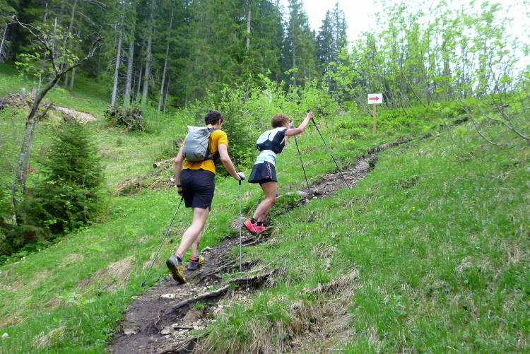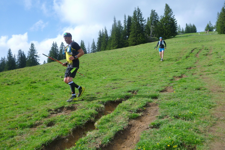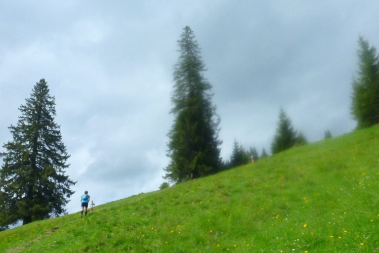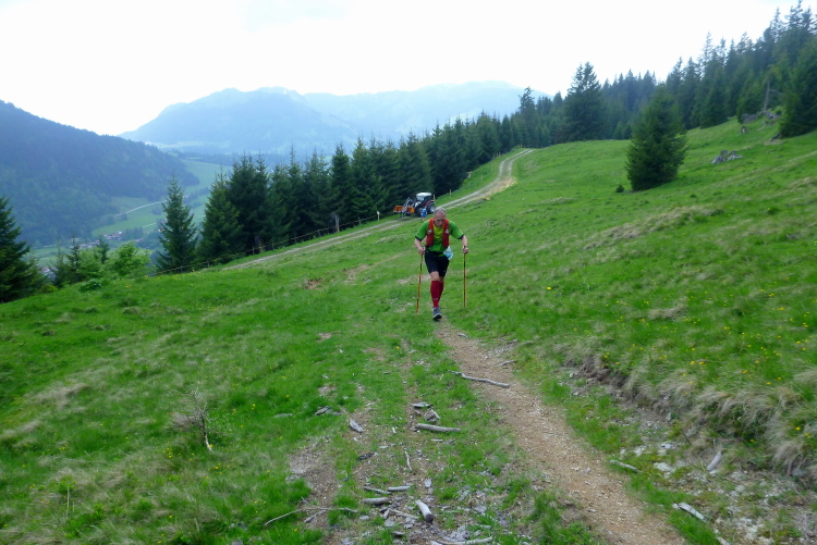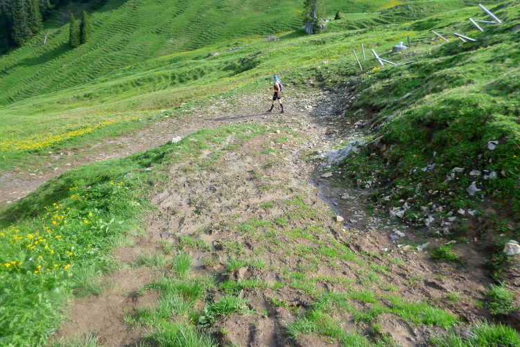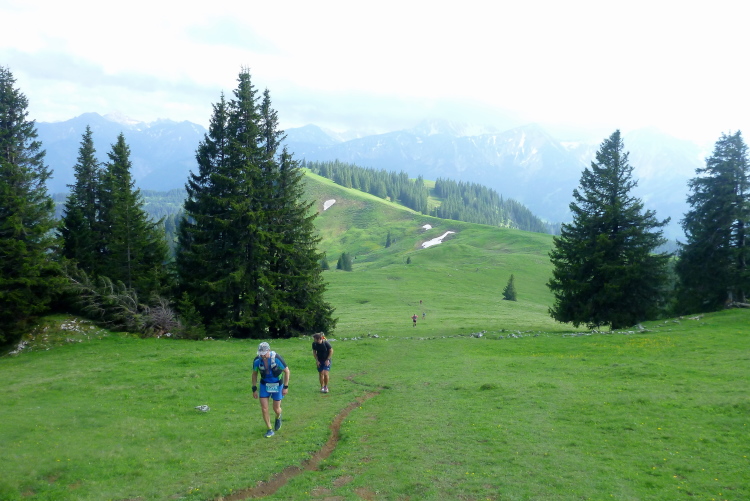 Dann sehe ich das Kreuz plötzlich über mir, ein Laufkollege macht ein Rundum-Panoramafoto und saugt die Gegend förmlich in sich auf. Hier muss ich mir etwas Zeit lassen und genießen. Zwei Drittel liegen hinter mir, der höchste Punkt des Laufs ist erreicht, 600 Hm Differenz sind es zum Tal. Schön ist es, anschließend halbwegs entspannt herunterzuhüpfen, während letzte Leidensgenossen noch schwerfällig hochhecheln, so wie ich noch ein paar Minuten zuvor. 250 Hm verlieren wir auf den nächsten zwei km. Teilweise sind die Wiesen sumpfig, die Wege rutschig. „Mi hot's beijtelt!“ klagt ein schlammdekorierter Mitläufer. Hirnlos darf ich also nicht gen Tal streben. Der letzte VP befindet sich bei km 24. Gut, dass ich neben der Pflicht-Notfallausrüstung auch einen halben Liter Wasser dabeihabe, der wird mich über die finalen km bringen. Allerdings rettet der mich nicht vor einem weiteren Aufstieg unmittelbar am Einstein, dem 1.866 m hohen Tannheimer Hausberg. Dann wird’s endgültig haarig.