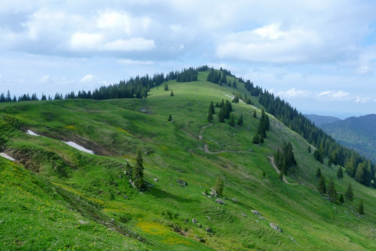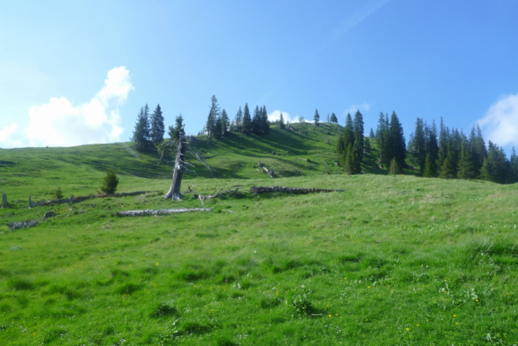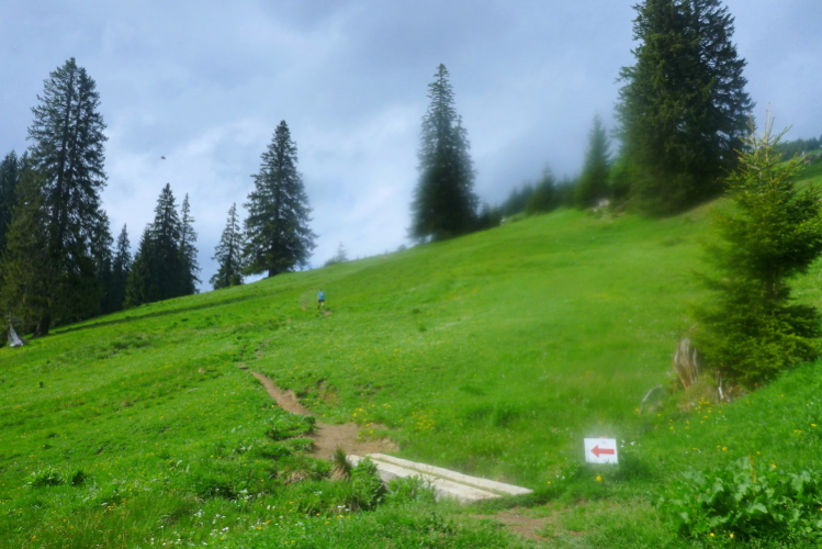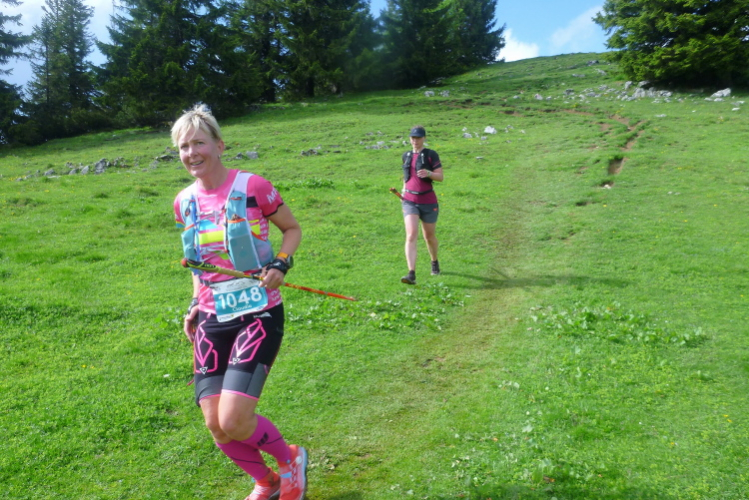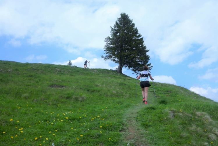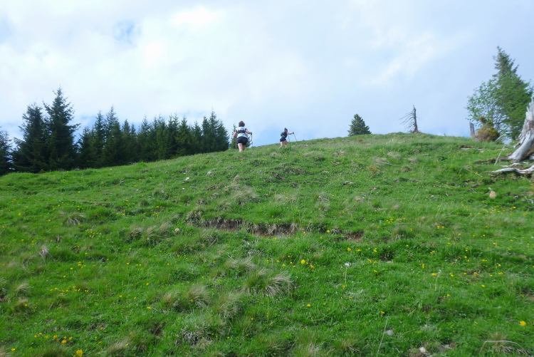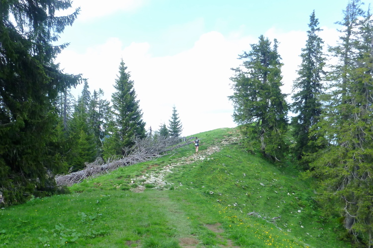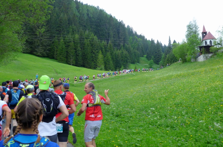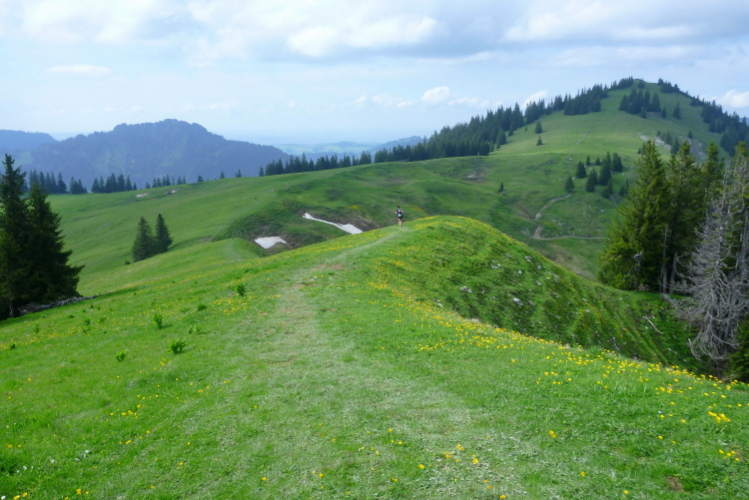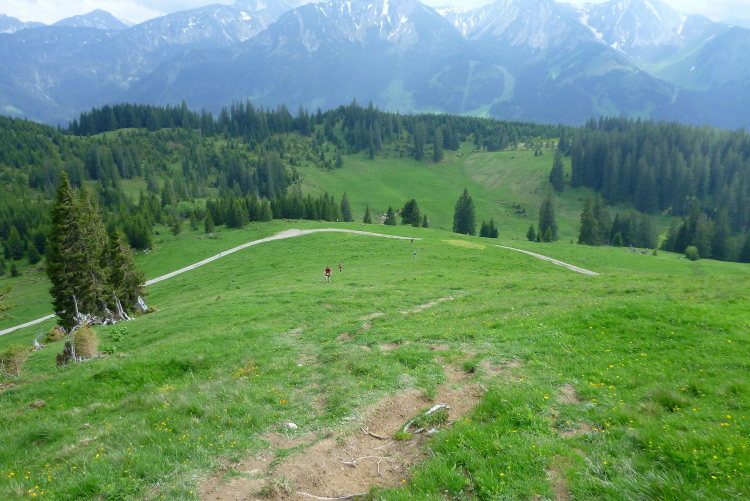 Dann sehe ich das Kreuz plötzlich über mir, ein Laufkollege macht ein Rundum-Panoramafoto und saugt die Gegend förmlich in sich auf. Hier muss ich mir etwas Zeit lassen und genießen. Zwei Drittel liegen hinter mir, der höchste Punkt des Laufs ist erreicht, 600 Hm Differenz sind es zum Tal. Schön ist es, anschließend halbwegs entspannt herunterzuhüpfen, während letzte Leidensgenossen noch schwerfällig hochhecheln, so wie ich noch ein paar Minuten zuvor. 250 Hm verlieren wir auf den nächsten zwei km. Teilweise sind die Wiesen sumpfig, die Wege rutschig. „Mi hot's beijtelt!“ klagt ein schlammdekorierter Mitläufer. Hirnlos darf ich also nicht gen Tal streben. Der letzte VP befindet sich bei km 24. Gut, dass ich neben der Pflicht-Notfallausrüstung auch einen halben Liter Wasser dabeihabe, der wird mich über die finalen km bringen. Allerdings rettet der mich nicht vor einem weiteren Aufstieg unmittelbar am Einstein, dem 1.866 m hohen Tannheimer Hausberg. Dann wird’s endgültig haarig.