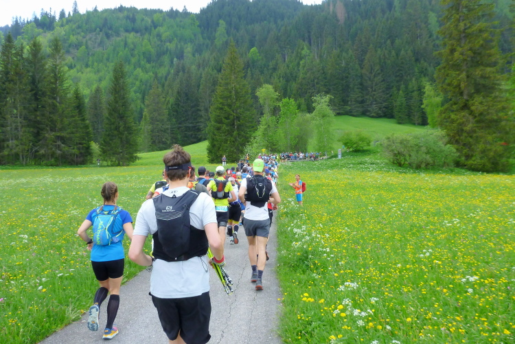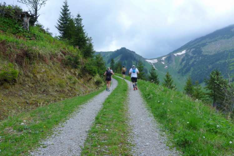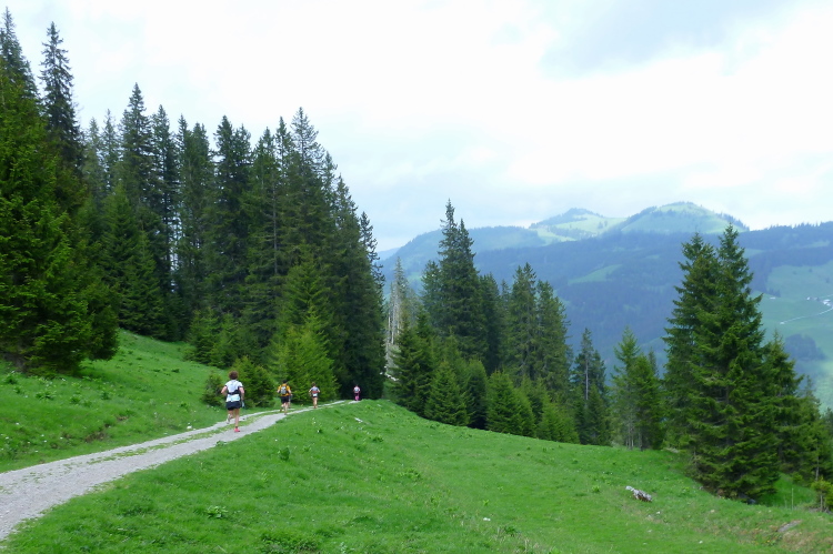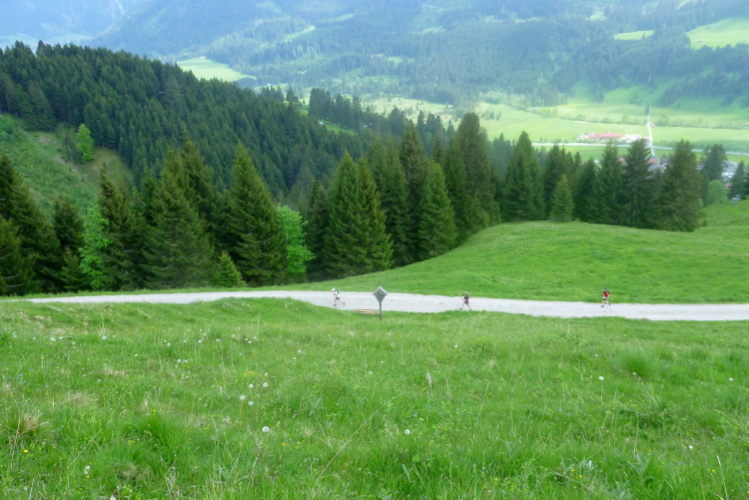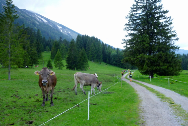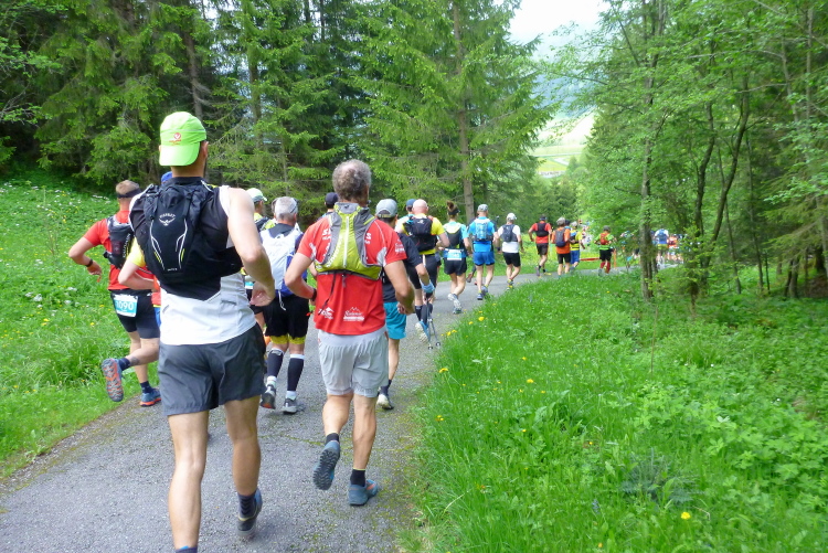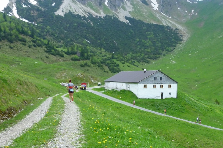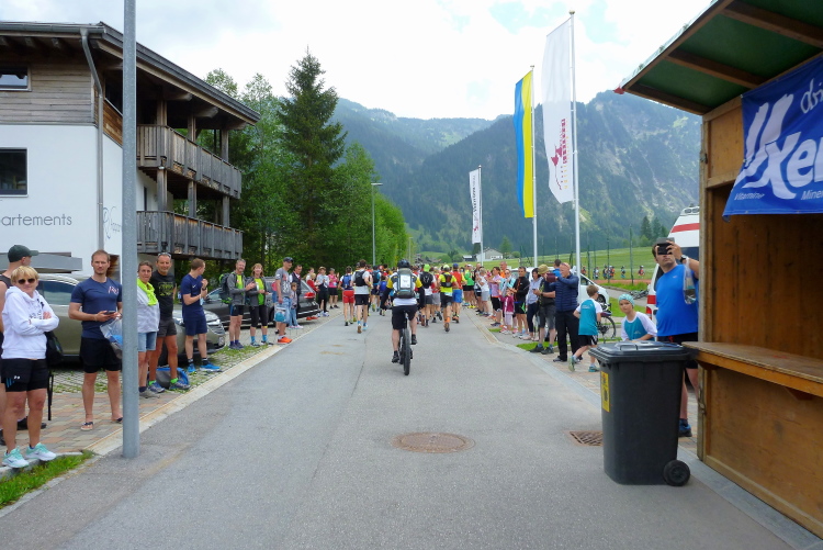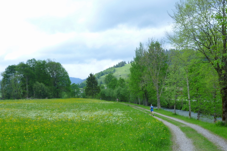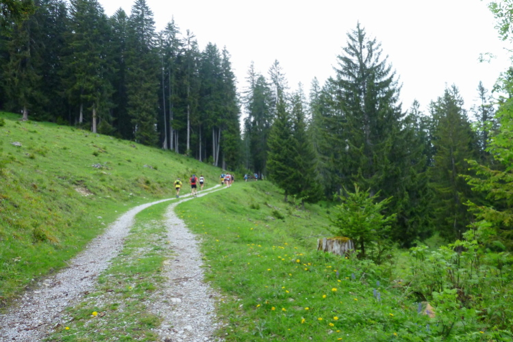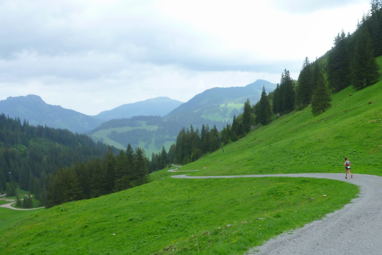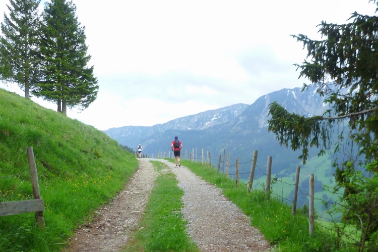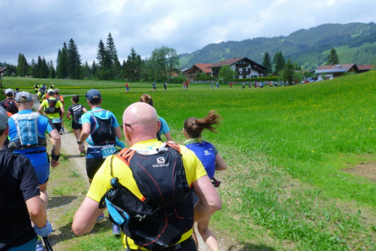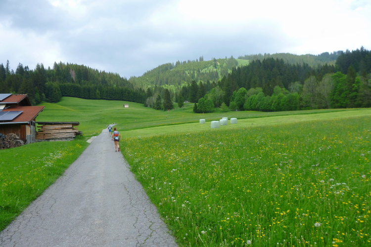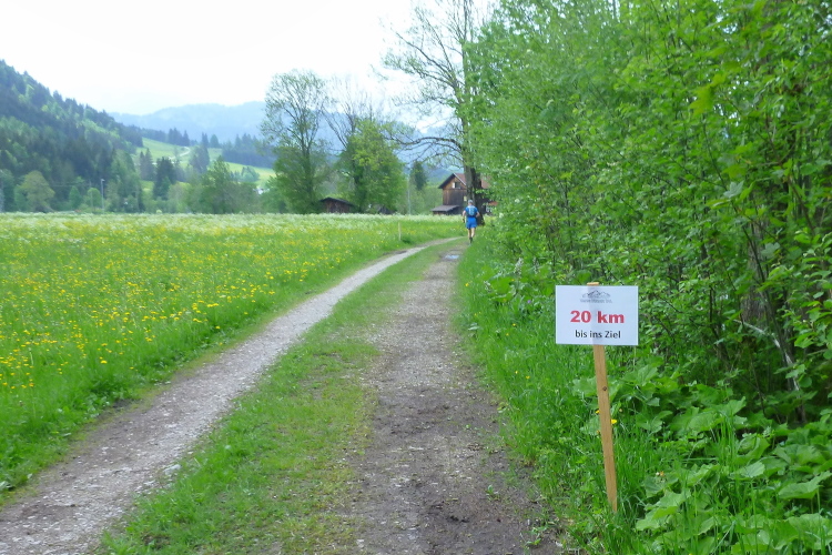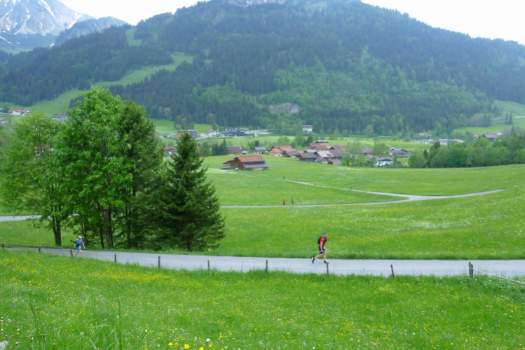 Das nächste Déjà-vu folgt ab dem achten km: Ein längerer, heftiger Abstieg auf Asphalt weckt Erinnerungen an die km 30-35 beim Allgäu-Panorama-Marathon, ich befürchte, nicht zu Unrecht, wieder heftige Nachwehen in den Oberschenkeln. Dann dürfen wir auf einen feinen Wiesentrail abbiegen, der Sturz in die Tiefe setzt sich fort. Als wieder Häuser auftauchen, ist das erste Drittel geschafft. Wir haben den Nachbarort Schattwald erreicht, nur ein schlapper km ist es bis auf die deutsche Seite. Man kredenzt uns Wasser, Iso, Bananen und Riegel. Schnell aufgetankt, bedankt und weiter voran!