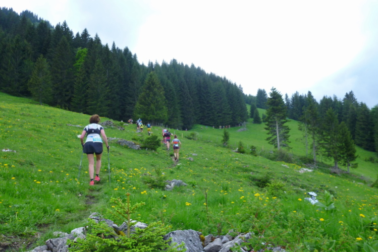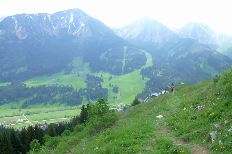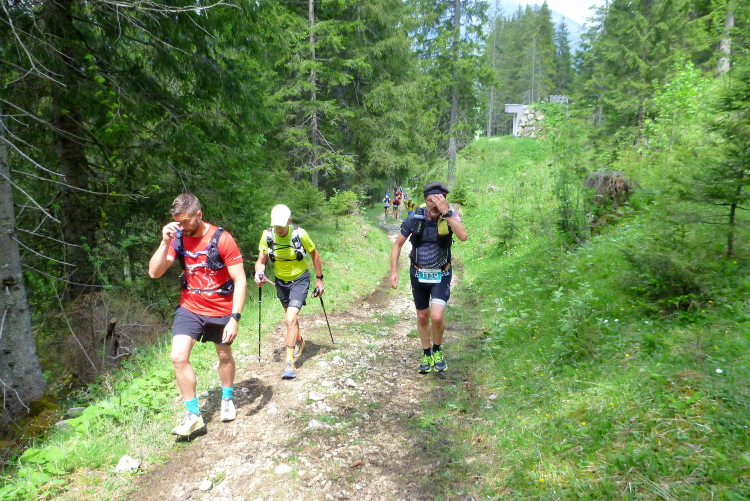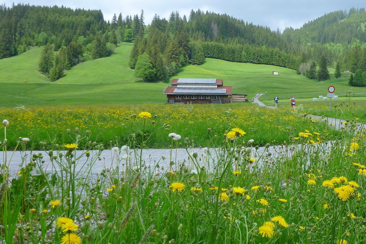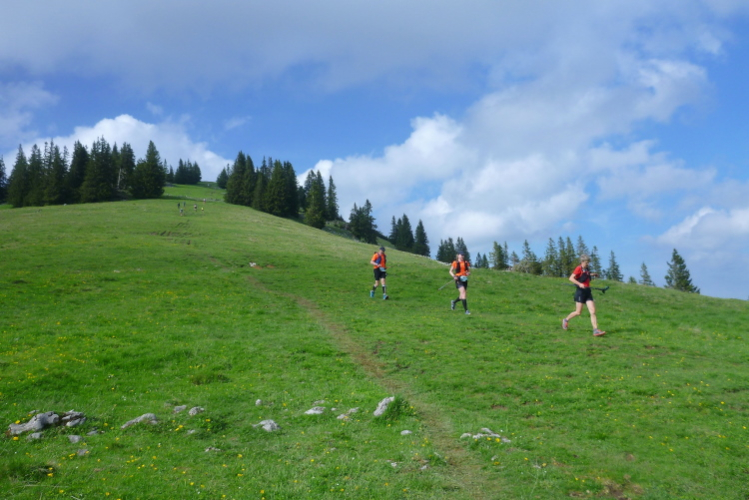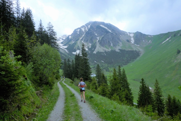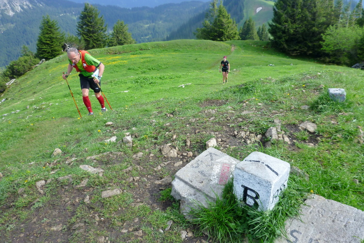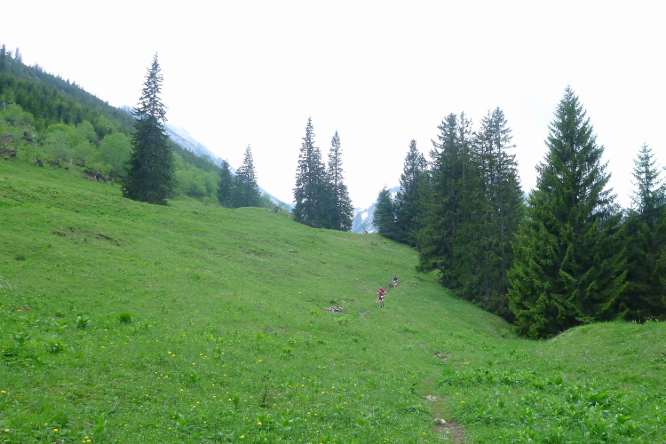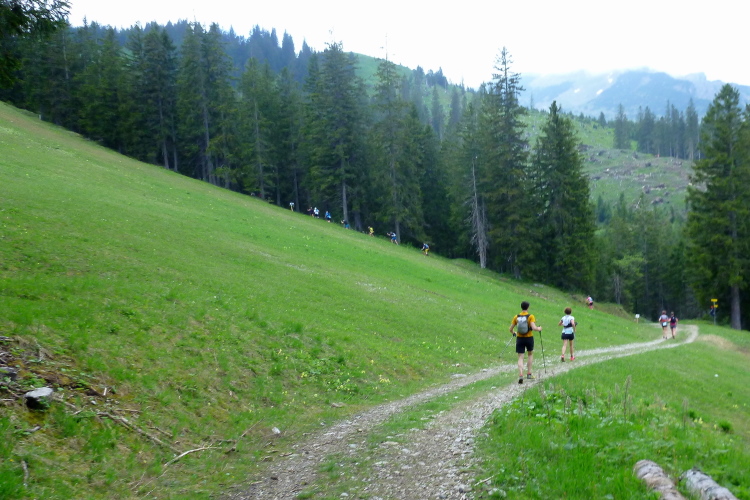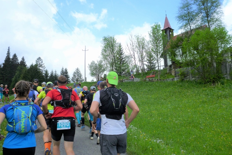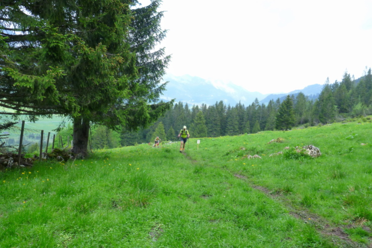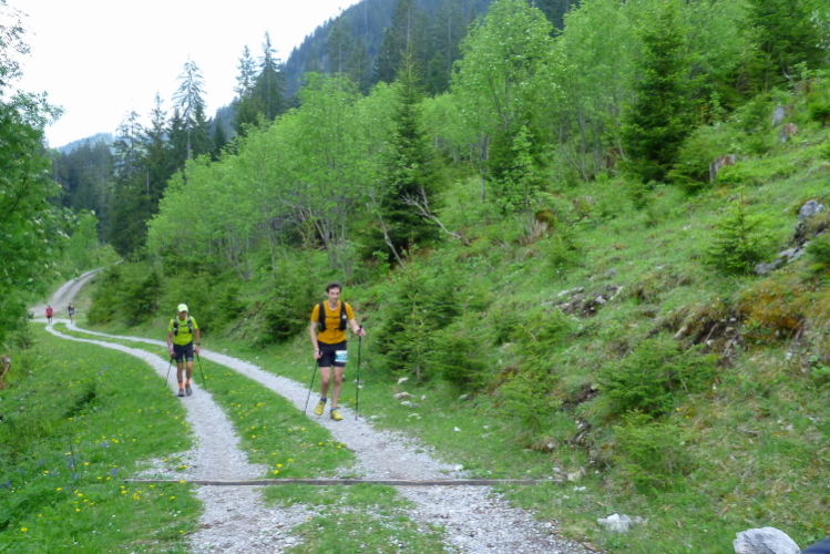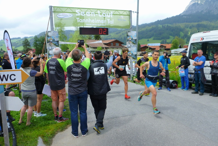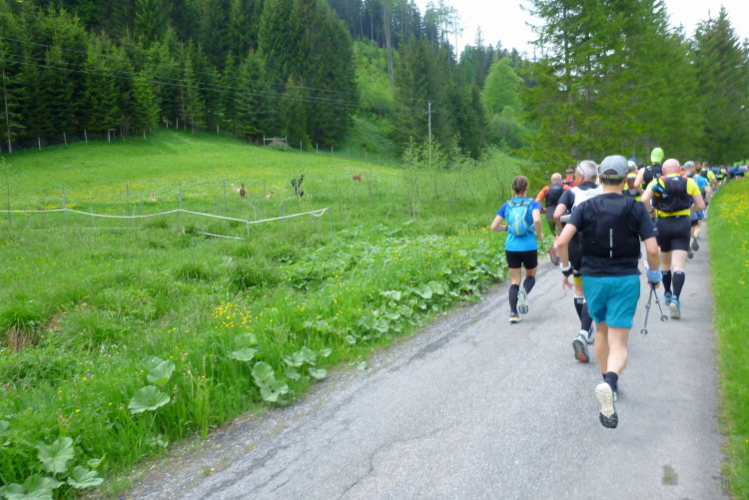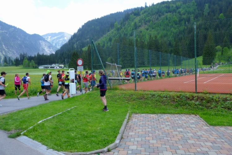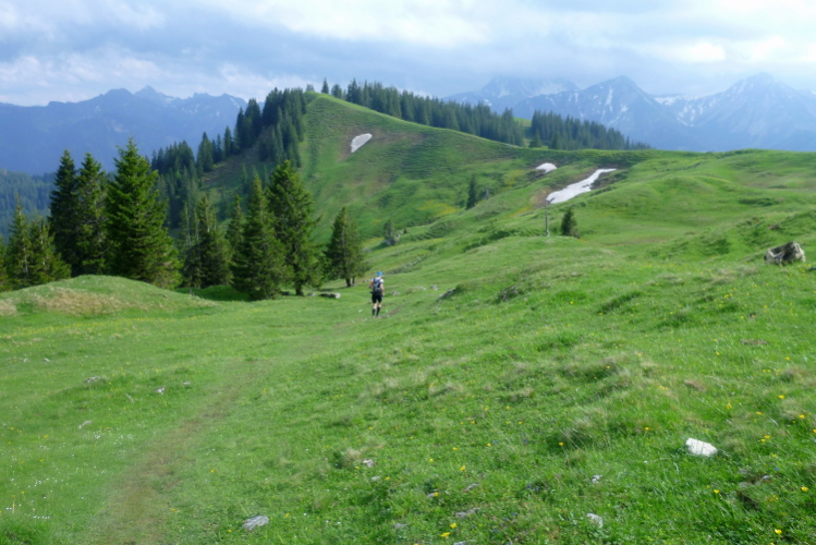 Das nächste Déjà-vu folgt ab dem achten km: Ein längerer, heftiger Abstieg auf Asphalt weckt Erinnerungen an die km 30-35 beim Allgäu-Panorama-Marathon, ich befürchte, nicht zu Unrecht, wieder heftige Nachwehen in den Oberschenkeln. Dann dürfen wir auf einen feinen Wiesentrail abbiegen, der Sturz in die Tiefe setzt sich fort. Als wieder Häuser auftauchen, ist das erste Drittel geschafft. Wir haben den Nachbarort Schattwald erreicht, nur ein schlapper km ist es bis auf die deutsche Seite. Man kredenzt uns Wasser, Iso, Bananen und Riegel. Schnell aufgetankt, bedankt und weiter voran!